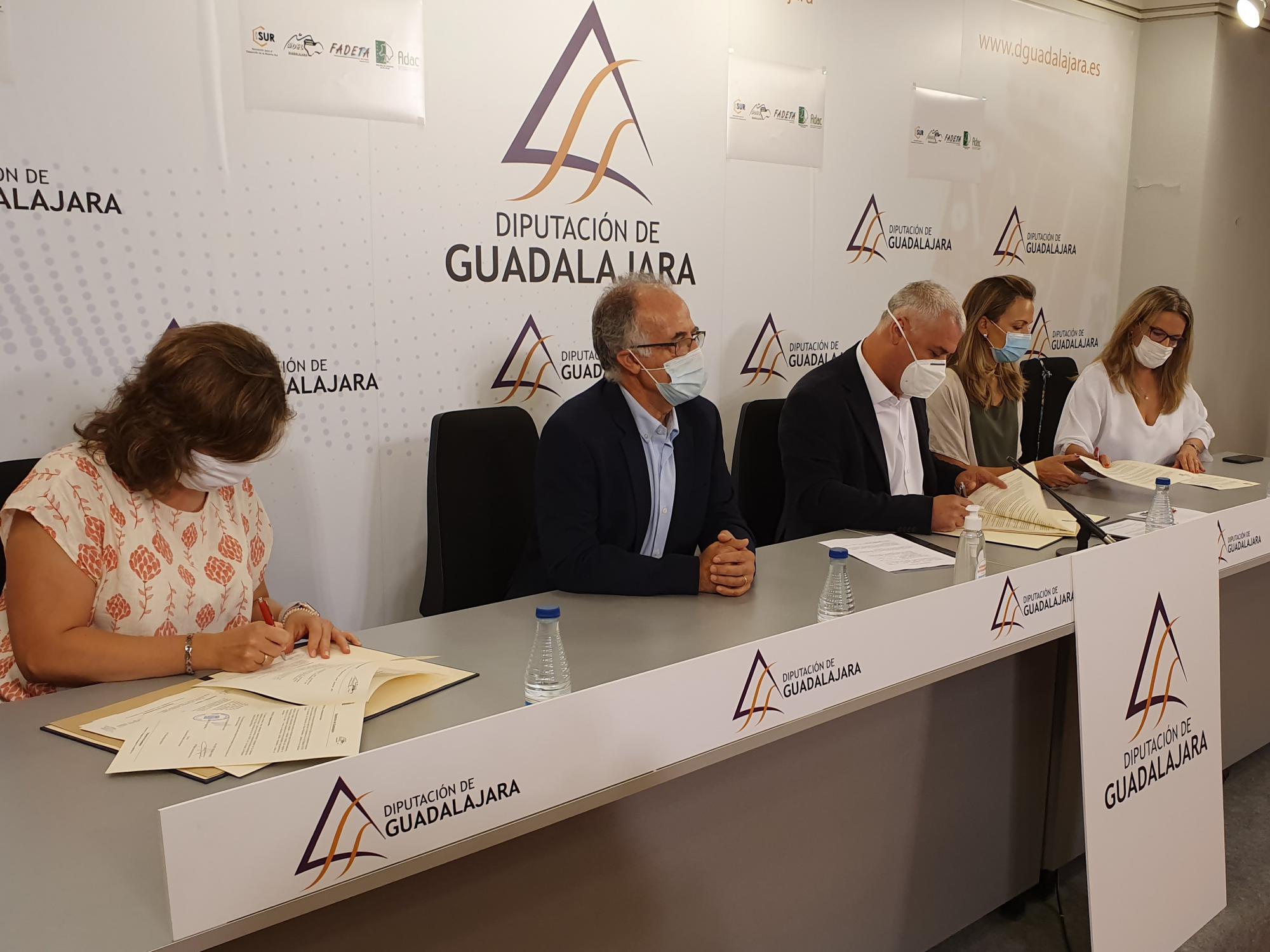 Hoy se han firmado los convenios entre el presidente de la Diputación, José Luis Vega, y los presidentes de ADEL-Sierra Norte (María Jesús Merino), ADAC (Vicente Hita), ADASUR (Esperanza Magán), ADR Molina de Aragón-Alto Tajo (Jesús Alba) y FADETA (Jesús Ortega), por el que estos grupos de desarrollo rural asumen la recepción, tramitación y valoración de solicitudes y el traslado para su resolución a la Diputación Provincial.