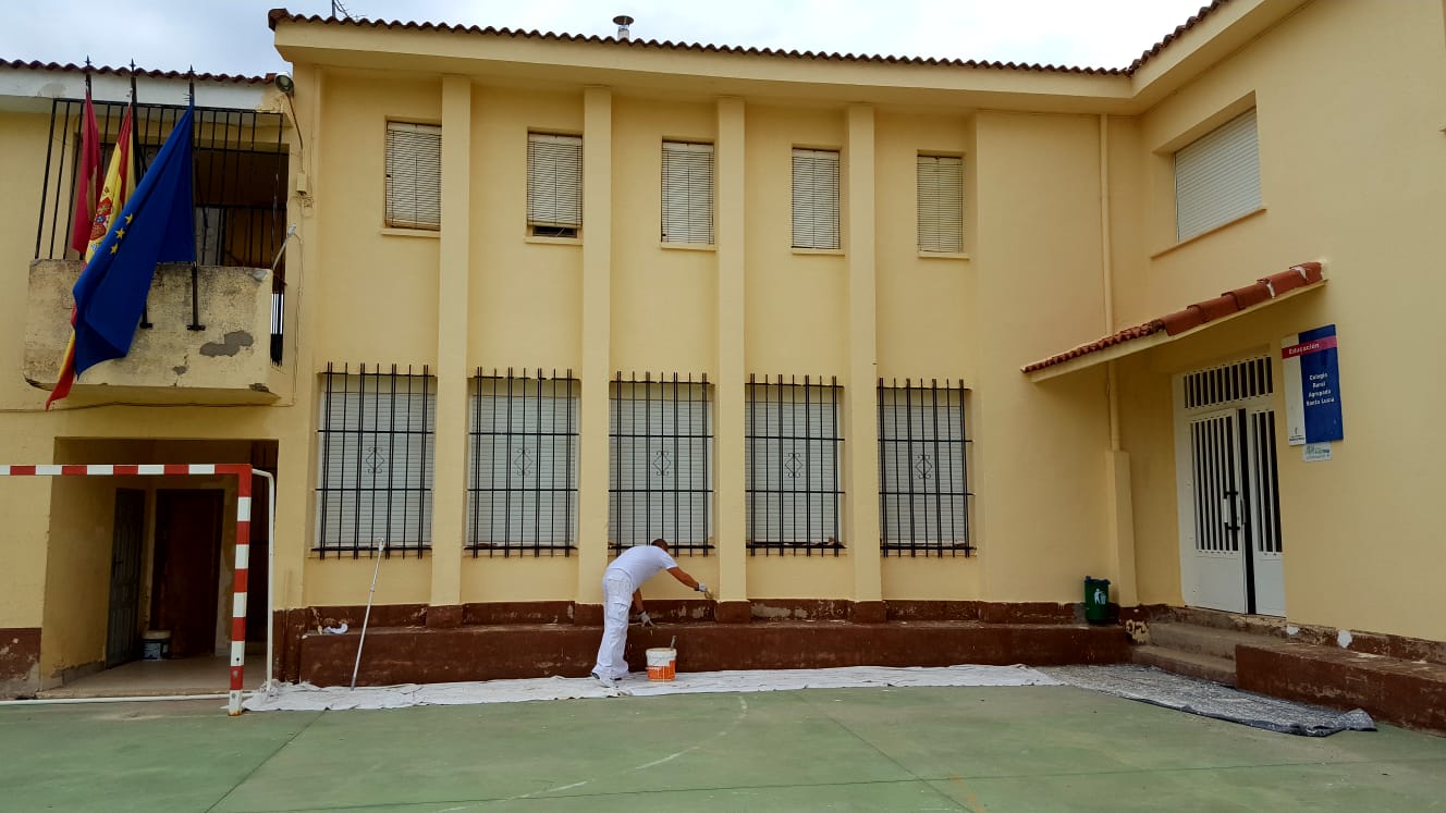 Además del acondicionamiento y pintura de una de las tres aulas con las que cuenta el colegio al objeto de albergar nuevos alumnos con motivo del aumento de matrícula motivado por la matriculación de cinco niños venezolanos recientemente llegados a la localidad, de realizar reparaciones en el tejadillo de entrada y en diversos paramentos del patio, se ha pintado el exterior de la totalidad del recinto escolar, incluidas verjas de ventanas y puertas de acceso, se ha eliminado la barrera que suponía el bordillo de la acera existente justo en la entrada al centro y a la pista deportiva, se ha renovado el arenero existente en la parte superior del recinto, y se van a instalar nuevas y más altas vallas para garantizar la seguridad de los pequeños de la localidad precisamente en esa zona del arenero.