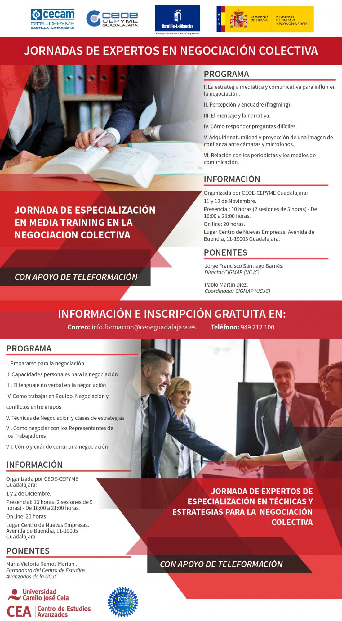 La primera de las jornadas se titula “Especialización en media training en la negociación colectiva” y tendrá lugar los días 11 y 12 de noviembre, en el centro de nuevas empresas de Guadalajara de 16:00 a 21:00 horas, en dos sesiones de cinco horas presenciales y 20 horas de teleformación, con las ponencias de Jorge Francisco Santiago Barnés, director CIGMAP (UCJC) y Pablo Martín Diez, coordinador de CIGMAP de la UCJC.
