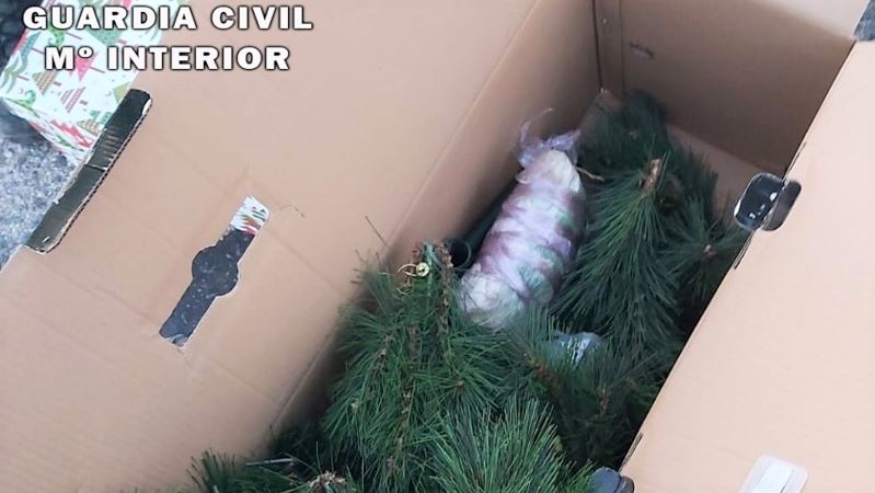 Tras la apertura de la caja, en la que se encontraban diversos adornos navideños, los agentes de la Benemérita localizaron dos paquetes, uno que contenía 807 gramos de una sustancia en polvo de color blanquecina y otro con 100 gramos de una sustancia compacta de color marrón.