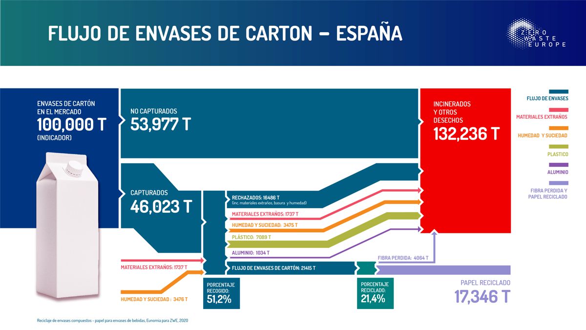 Así, gracias a este análisis, se estima que en el España el porcentaje estimado de reciclaje real (el 21,5 %) es menor a la tasa del 80 % que establece la Asociación de Envases de Cartón para Bebidas y Medio Ambiente (ACE, por sus siglas en inglés), y la tasa de recogida del 51,2 %.