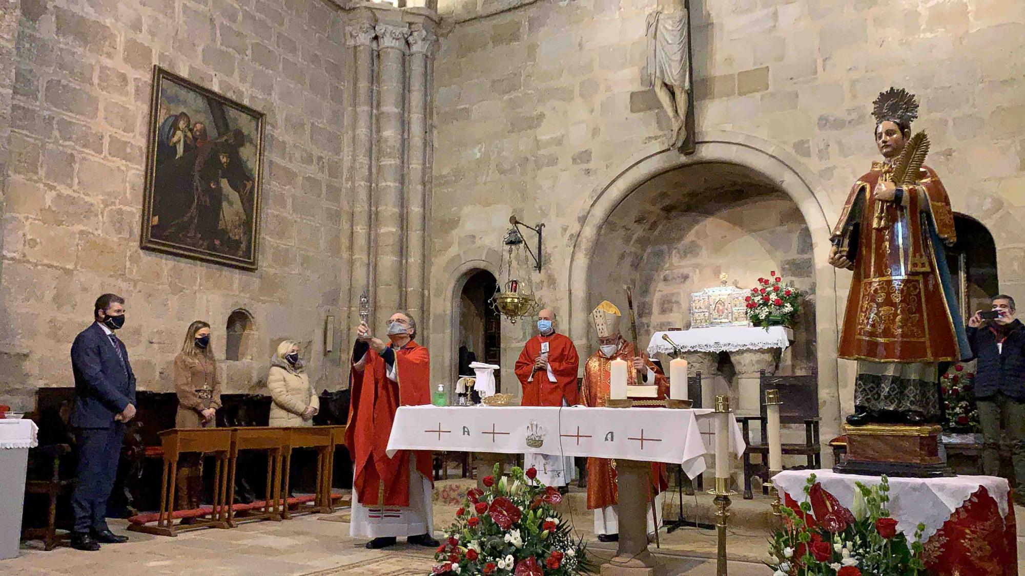 La celebración ha quedado reducida únicamente al oficio religioso, presidido por el obispo de la diócesis de Sigüenza-Guadalajara, Atilano Rodríguez, que han concelebrado junto al prelado los dos abades de la Cofradía y párrocos de San Vicente, Jesús de las Heras y Juan Antonio Marco. El aforo de la maravillosa Iglesia románica de San Vicente se ha limitado a un 40%, según indica la normativa antiCOVID19 vigente, respetándose en todo momento la distancia de seguridad. Este año no se han vendido las rosquillas del santo, bendecidas por el abad, en la Travesaña Alta, 6. Sin embargo, Irene Gómez, dueña de la pastelería Los Gustos de Antes que las hornea estos últimos años, ha propiciado que la tradición se pudiera cumplir allí mismo, en su establecimiento, en una ceremonia íntima. Se han elaborado 9.000 unidades, 750 docenas, de las que ya quedan muy pocas.