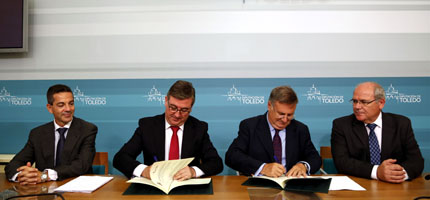 El consejero de Educación, Cultura y Deportes del Gobierno de Castilla-La Mancha, Marcial Marín, y el presidente de la Diputación de Toledo, Arturo García-Tizón, han suscrito esta mañana el protocolo general de colaboración para impulsar la musealización y puesta en valor del yacimiento arqueológico denominado "Ciudad de Vascos", declarado Monumento histórico-artístico el 4 de junio de 1938, lo que implica su inclusión en la categoría de Bien de Interés Cultural.