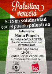 La UJCE e Izquierda Unida han organizado el próximo jueves, 18 de septiembre, a las 7 de la tarde en el Centro Social de la Avenida de Venezuela de Guadalajara capital, un acto de solidaridad con el pueblo palestino. Para este acto contarán con la presencia de Manu Pineda, que acaba de regresar el pasado 14 de agosto de la zona en conflicto, a la que acudió como escudo humano por la asociación UNADIKUM y que explicará en primera persona la realidad de Palestina tras la última invasión de Gaza.