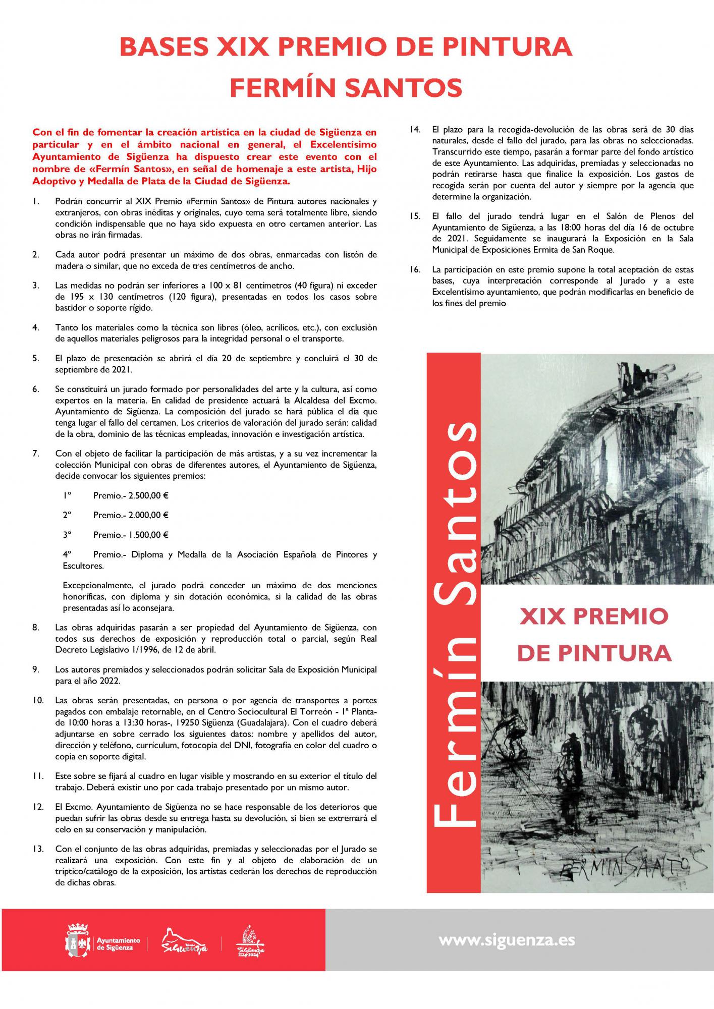 El Ayuntamiento de Sigüenza convoca la XIX Edición del Premio de Pintura Fermín Santos, dotada con 6.000 euros en premios.
