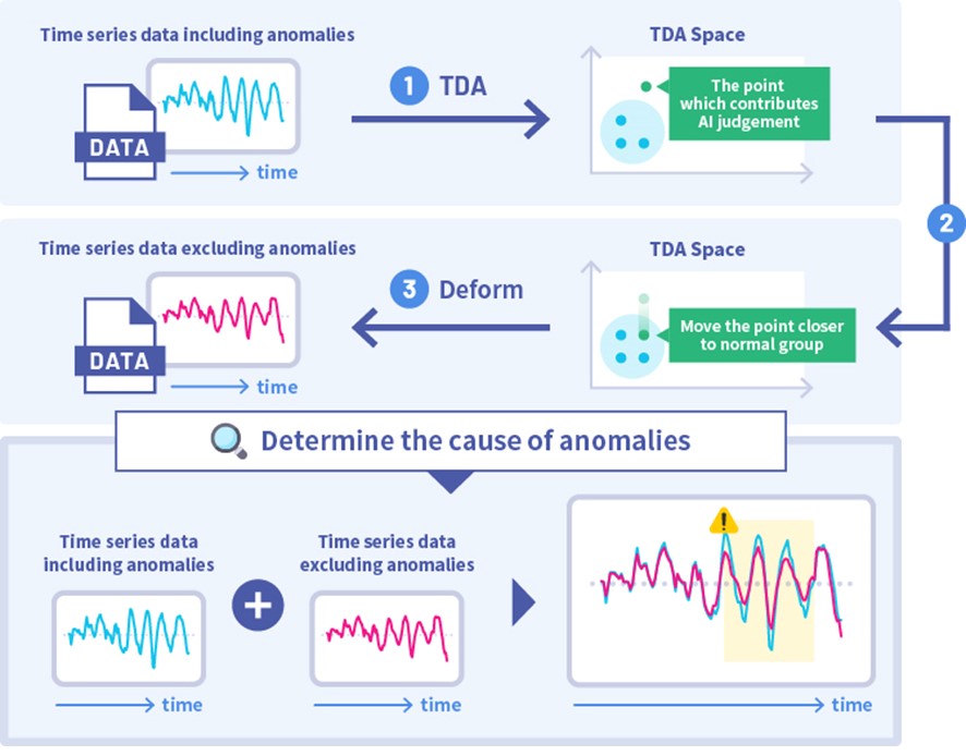 Fujitsu e Inria, más concretamente el equipo del proyecto DATASHAPE de Inria, dirigido por Frédéric Chazal en Francia, han desarrollado con éxito una nueva tecnología basada en el análisis topológico de datos (TDA) (1) que puede identificar los factores que contribuyen a la detección de anomalías por parte de la IA para las series temporales de datos y visualizar las diferencias en las decisiones de la IA durante circunstancias normales, así como en las anómalas.