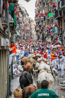 En la imagen, realizada por este fotógrafo profesional de Yunquera de Henares, se ve cómo los astados de la manada, azuzados por las varas de los pastores, se van abriendo hueco al comienzo de una calle Estafeta repleta de corredores que miran hacia atrás su llegada, observados por cientos de ojos que no pierden detalle desde lo alto de los balcones.