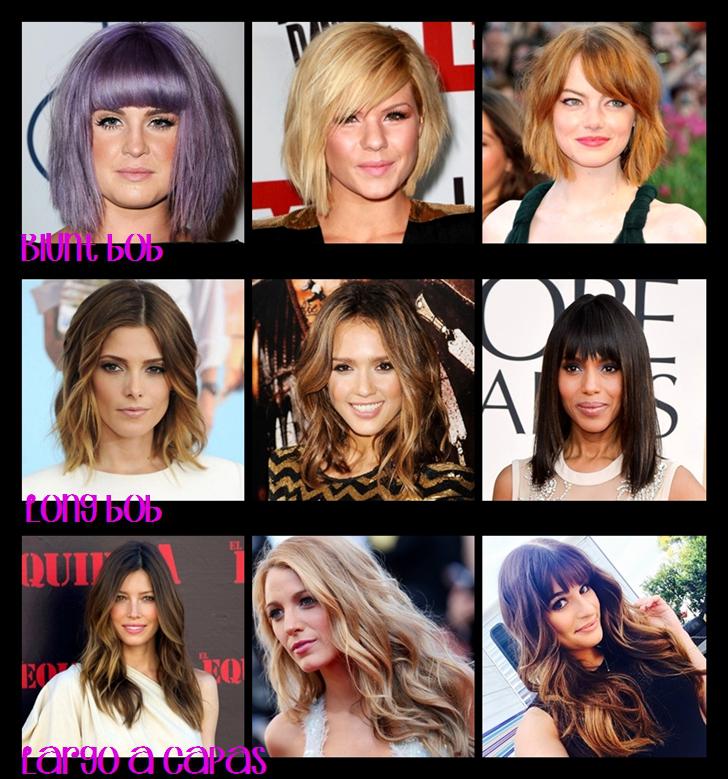 Este corte de pelo es similar al anterior en largo, puesto que no llega a los hombros, pero es un corte desfilado. Mis propuestas favoritas son las de blunt bob liso, por lo que entre mis favoritas no podía faltar Kelly Osbourne, con su flequillo recto y su color lila empolvado; también queda bien con flequillo al lado, estilo por el que apuestan tanto Kimberly Caldwell, con un look más despeinado, y Emma Stone, quien elige unas ondas ligeramente marcadas.