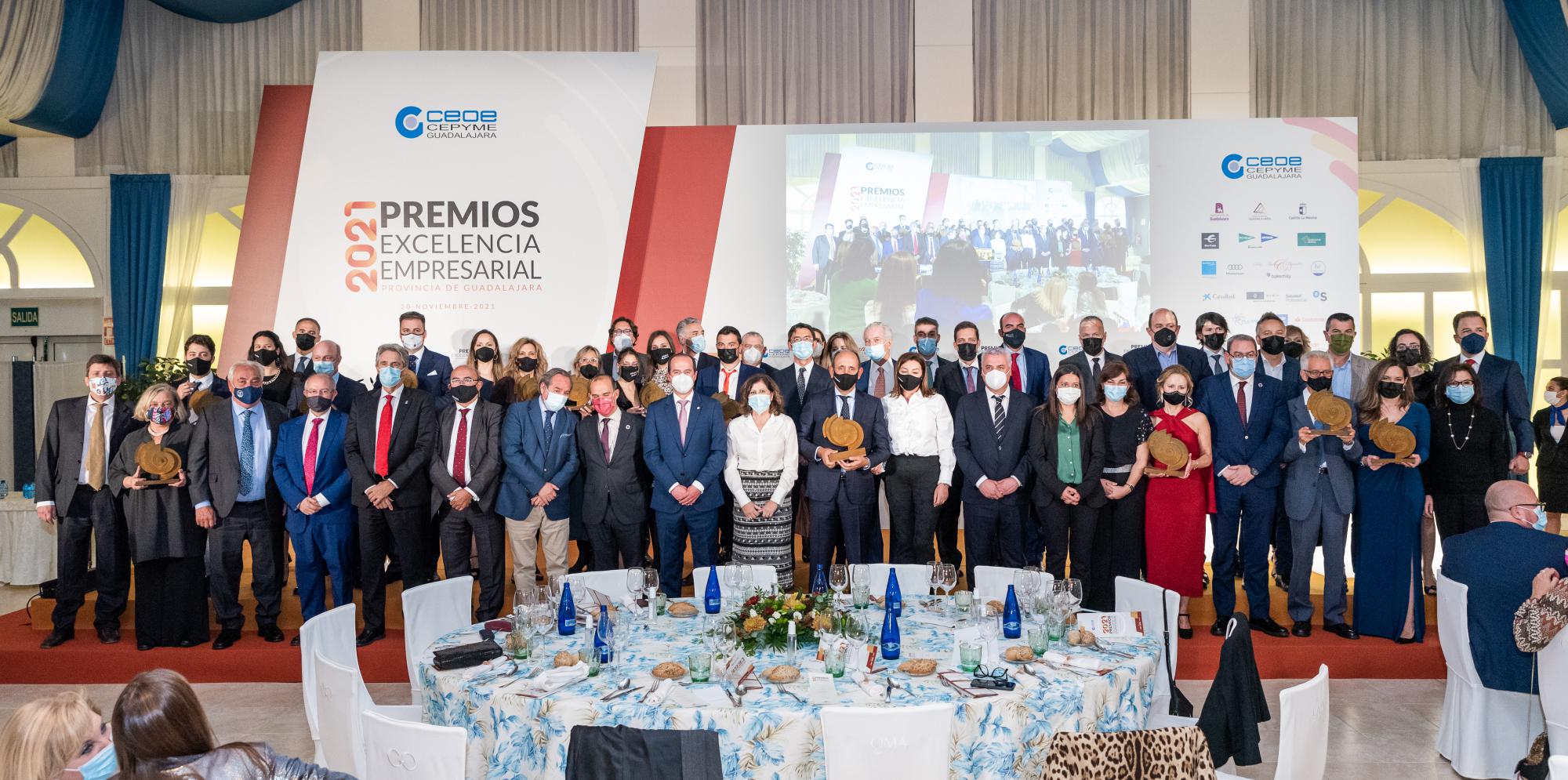 CEOE-CEPYME Guadalajara ha vuelto a la presencialidad de sus Premios Excelencia Empresarial con una gala llena de recuerdos, para aquellos que nos han dejado debido al COVID-19, y de homenajes, en general, a todos los empresarios, autónomos, pymes y emprendedores de la provincia de Guadalajara y, más en particular, a los premiados de 2020, quienes tuvieron su foto de familia y su reconocimiento público y a los Premios Excelencia Empresarial 2021, encabezados por la Empresa del Año, Montepino.