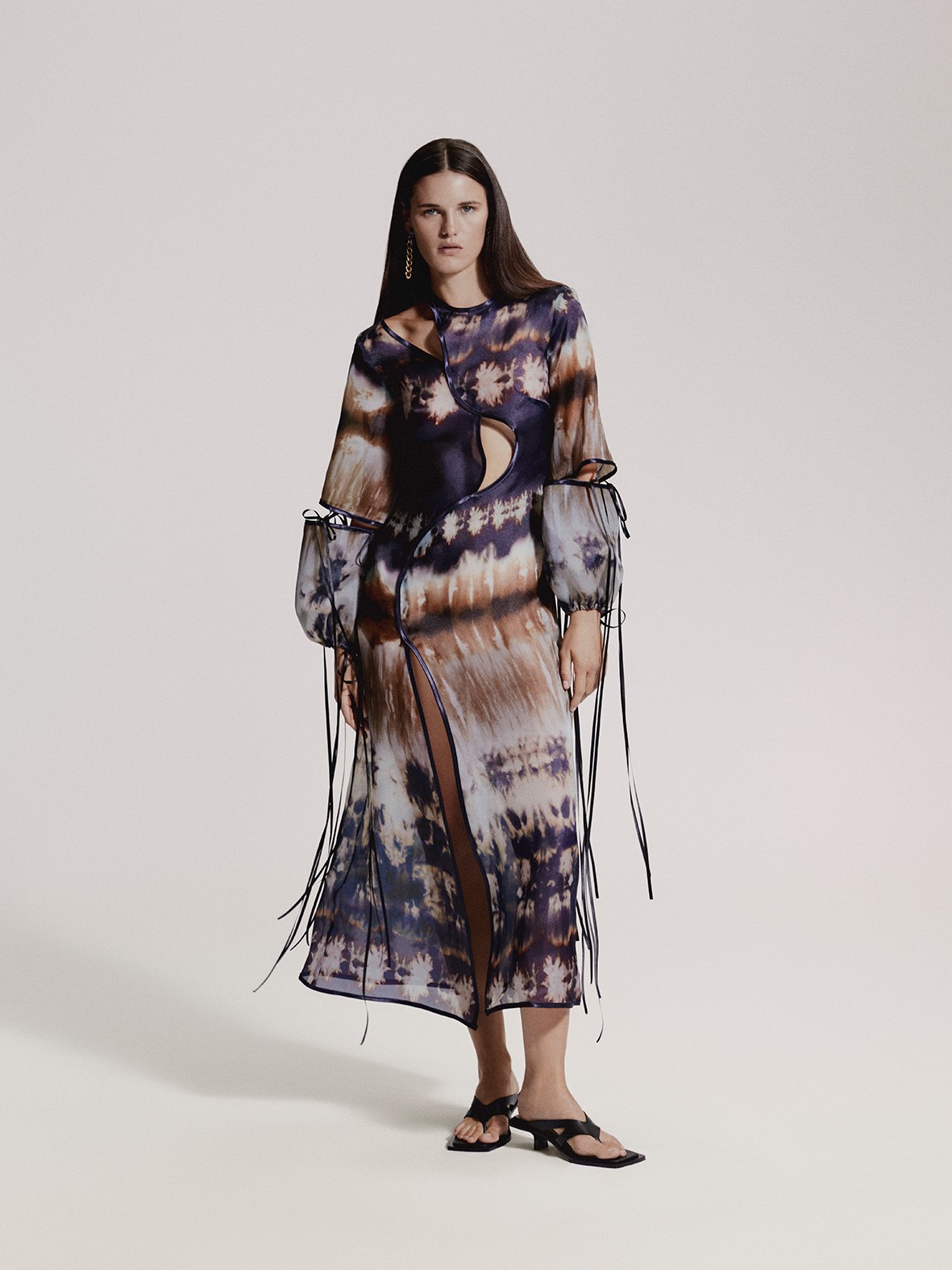 La influencer lució este vestido midi de corte evasé, semitransparente, realizado en organza con estampado tie-dye de piezas de patrón separadas y unidas por lazos, perteneciente a la colección ANNUAL 21/ 22.