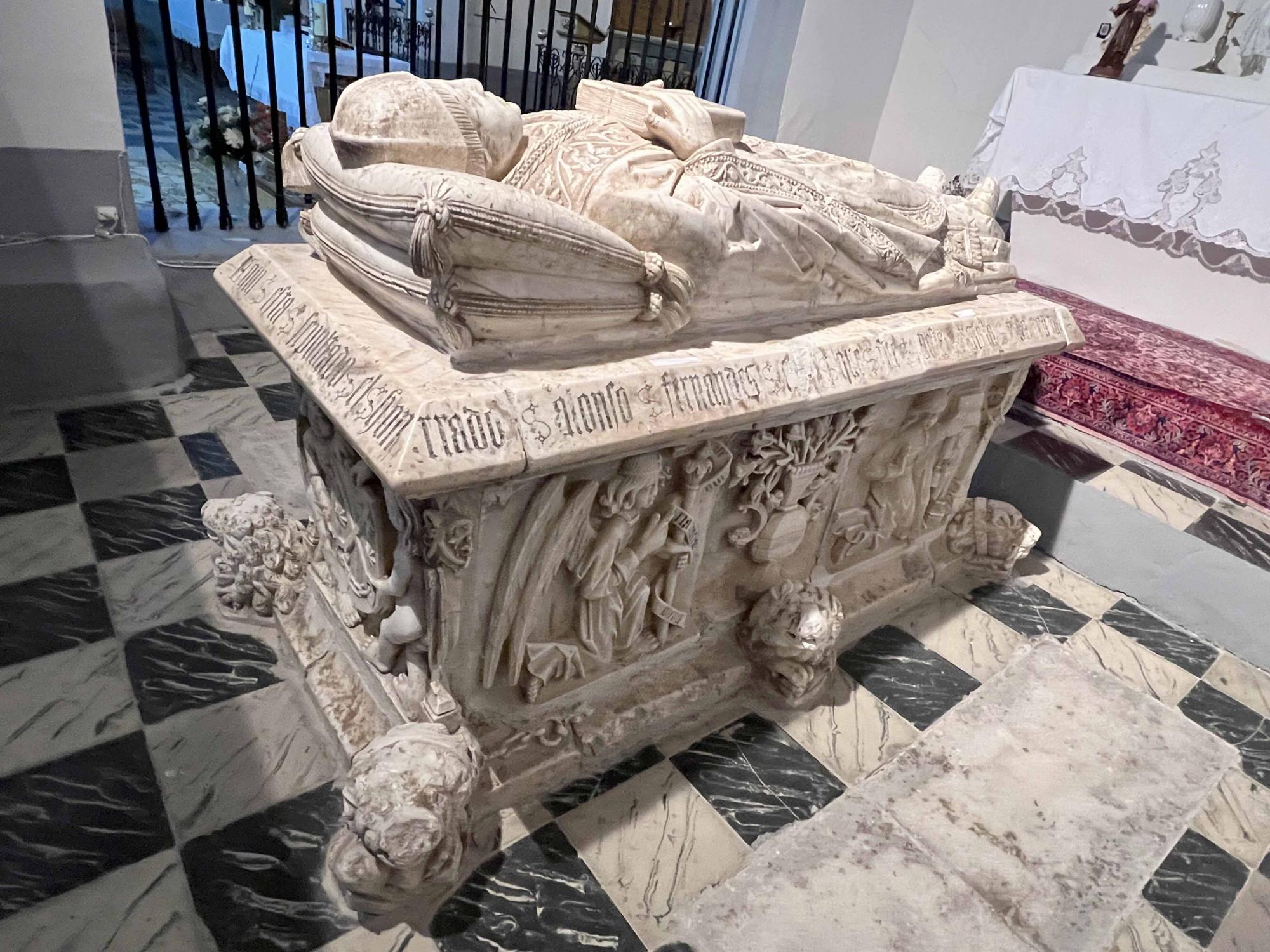 El sepulcro, de muy buena factura, está elaborado en un alabastro blanco-amarillento de Cogolludo, lo que pudo ser el origen de su apelativo de “El Dorado”. Según se decía, al introducir una vela en el interior, la luz atravesaba levemente las paredes cubriendo todo de un resplandor áureo. Su estilo muestra un sarcófago sustentado por seis cabezas de león y coronado por la escultura yacente de don Alonso Fernández ataviado con sus ropajes listos para la liturgia. A su alrededor, una leyenda en preciosa letra gótica promulga su identidad, título y fecha de la muerte. Sus lados largos, de estructura tripartita, tienen representados por una cara la anunciación, con una virgen y un arcángel Gabriel separados por un jarrón de azucenas, y por la otra, las figuras de santa Catalina y santa Lucía, así como dos escudos heráldicos representando el sacerdocio. Un escudo similar se observa en el espacio de la cabecera, sujeto por dos ángeles, mientras que a los pies se puede ver de nuevo a don Alonso en actitud orante con una marcada tonsura. No obstante, la distribución de los relieves no es la original pues, tras la destrucción de la guerra, la restitución del sepulcro se hizo sin mucho esmero, por lo que algunas de las figuras se ajustaron con la orientación inversa a la que le correspondía (como los dos escudos del costado izquierdo) y, con toda seguridad, en distinta posición. Actualmente, gracias al esfuerzo de la parroquia de Jirueque y sus parroquianos, existe un proyecto serio de restauración que, con toda seguridad, hará que el sarcófago recupere parte del esplendor de antaño.