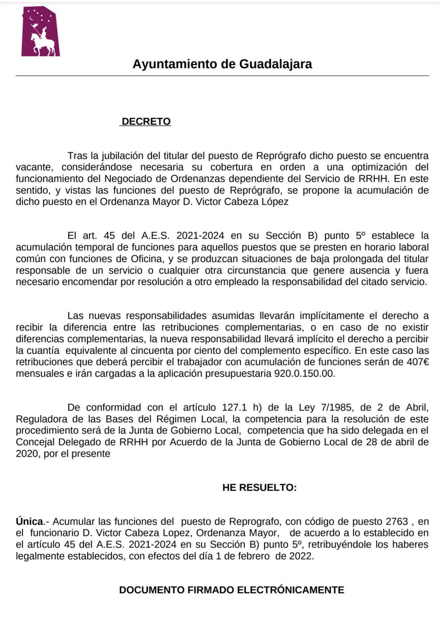 El Grupo Popular en el Ayuntamiento de Guadalajara ha vuelto a denunciar hoy en rueda de prensa “el trato de favor” a través de “sobresueldos” en forma de productividad con dinero público que el alcalde socialista Alberto Rojo, con la complicidad de Ciudadanos, está dando de forma reiterada al ex viceportavoz socialista, hoy ordenanza del Ayuntamiento, Víctor Cabeza. A los “continuos premios económicos” que lleva percibiendo este funcionario desde el año 2020 y que ascienden ya a “unos 14.000 euros”, se suma ahora su nombramiento por decreto de las funciones del puesto de reprógrafo, es decir, responsable de hacer las fotocopias del Consistorio. Se trata de un puesto, según se justifica en el decreto, cuyo titular se ha jubilado hace más de un año, por lo que el gobierno de Rojo aprovecha esta situación para acumular estas funciones al Ordenanza Víctor Cabeza, “que deberá percibir” por ello un total de “407 euros mensuales” con efectos del día 1 de febrero de 2022.