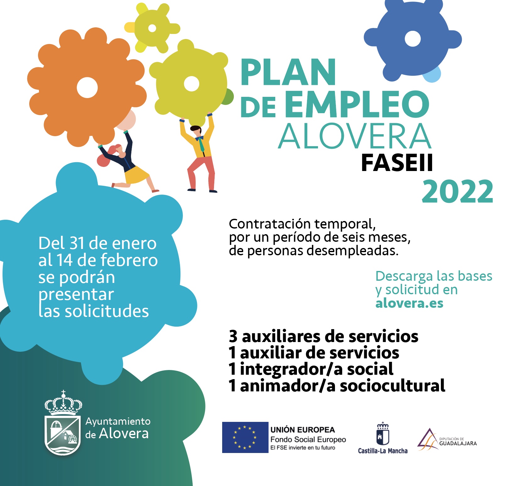 Esta convocatoria está financiada por el Fondo Social Europeo como parte de la respuesta de la Unión a la pandemia Covid19, la Junta de Comunidades de Castilla-La Mancha, la Diputación Provincial de Guadalajara y el Ayuntamiento de Alovera.