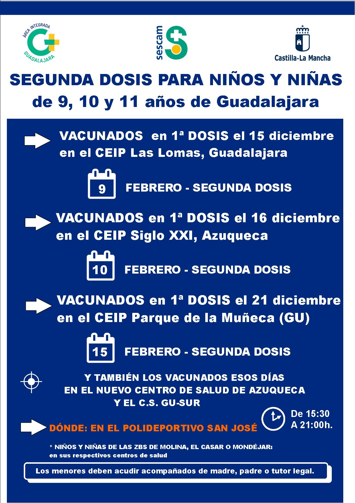 Mañana se vacunará a los menores que iniciaron su vacunación el pasado 16 de diciembre en el colegio Siglo XXI de Azuqueca, y el martes 15 de febrero será el turno de los niños y niñas vacunados el pasado 21 de diciembre en el CEIP Parque de la Muñeca de Guadalajara.