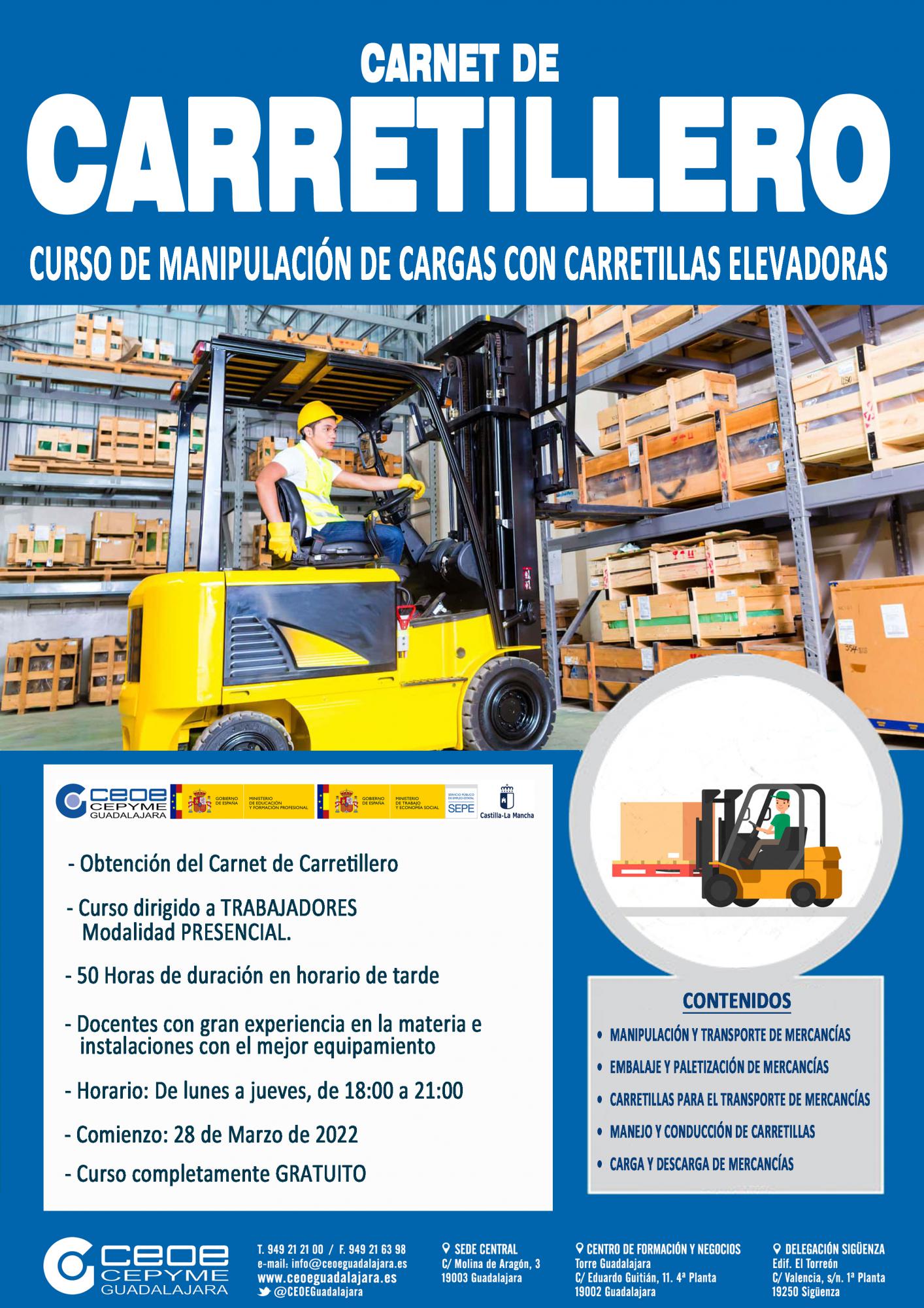 El curso de “Manipulación de cargas con carretillas elevadoras”, está dirigido a trabajadores en activo y será presencial con un horario de lunes a jueves de 18:00 a 21:00 horas en el centro de formación que CEOE-CEPYME Guadalajara tiene en la empresa DSV y dará comienzo el próximo 28 de marzo.