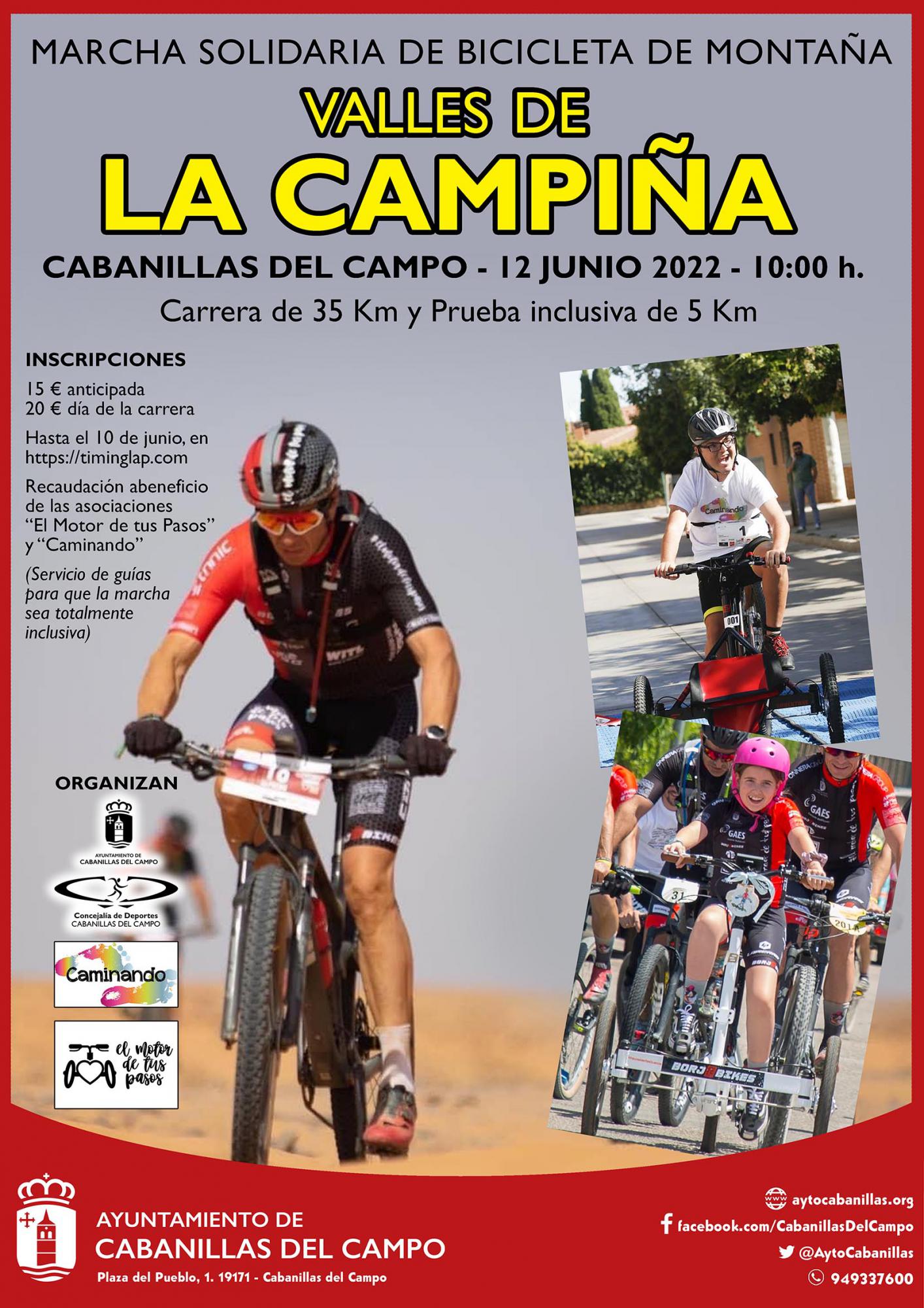 La Concejalía de Deportes del Ayuntamiento de Cabanillas, y las asociaciones «El Motor de tus Pasos» y «Caminando», organizarán para el próximo domingo 12 de junio la carrera solidaria de bicicleta de montaña «Valles de la Campiña», cuya finalidad es recaudar fondos para ayudar a la labor social que realizan ambas asociaciones de Cabanillas.
