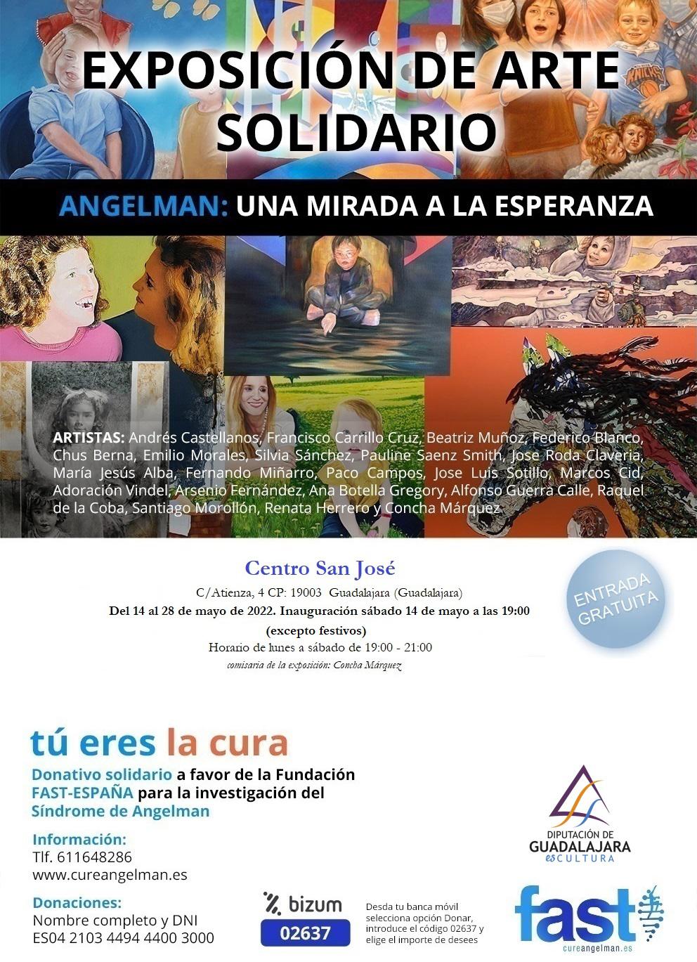 Mañana, sábado 14 de mayo de 2022, a partir de las 19:00 horas se inaugurará en la Sala Multiusos de la Diputación de Guadalajara (planta baja del Centro San José de nuestra capital) la exposición de Arte Solidario “Angelman: una mirada a la esperanza” con obras de una veintena de prestigiosos artistas.