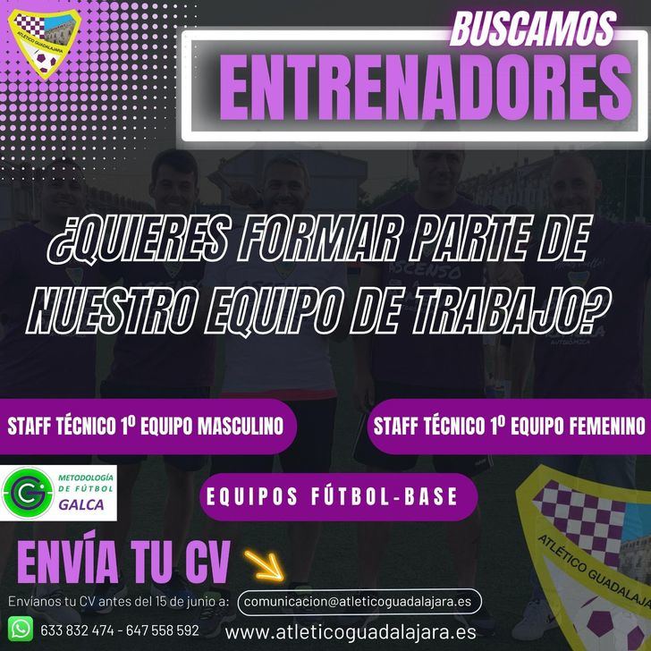 Desde el Atlético Guadalajara se buscan nuevos entrenadores para sus equipos. El conjunto arlequinado quiere dar la oportunidad a nuevos técnicos para continuar con su formación y dar más calidad a sus equipos de fútbol. Poco a poco el club sigue creciendo y se necesitan más entrenadores para cubrir los equipos. Además, también se necesitan monitores para el VII Campus de Verano, que se desarrollará entre el 27 de junio y el 29 de julio, en las instalaciones de la Fuente de la Niña y la Piscina de San Roque.