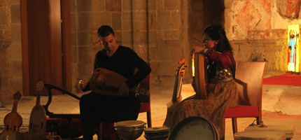 El dúo propuso un viaje musical a lugares exóticos y tiempos remotos en la Iglesia de Santiago de Sigüenza, de la mano de una colección de instrumentos medievales