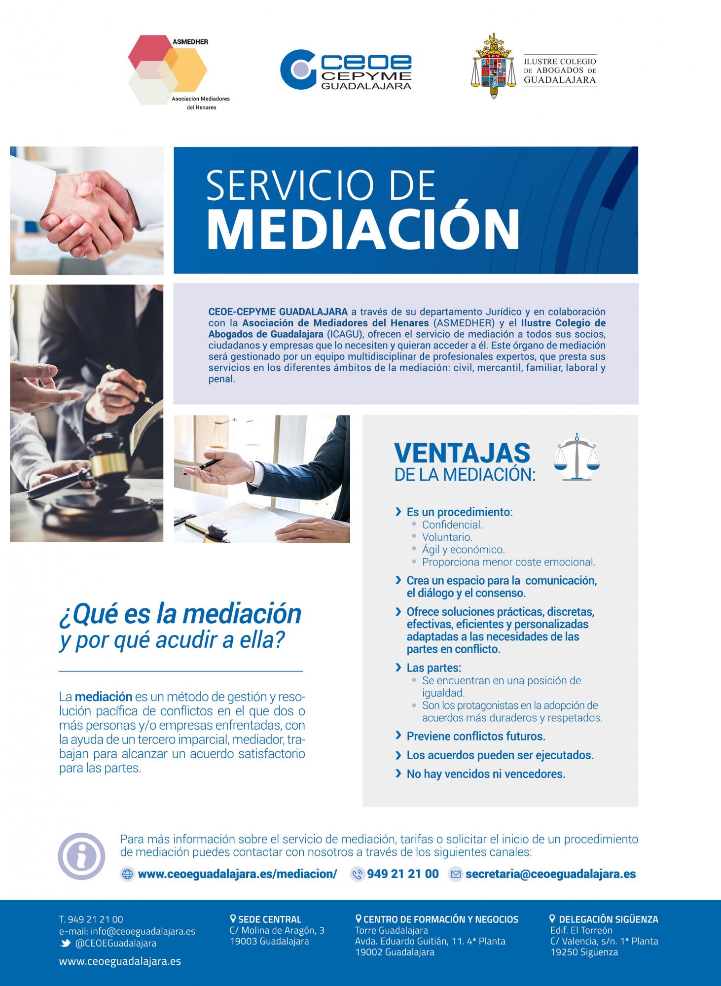 Para más información sobre el servicio de mediación, tarifas o solicitar el inicio de un procedimiento de mediación, se puede hacer a través de www.ceoeguadalajara.es/mediacion/ en el 949 21 21 00 o a través del correo electrónico [email protected]