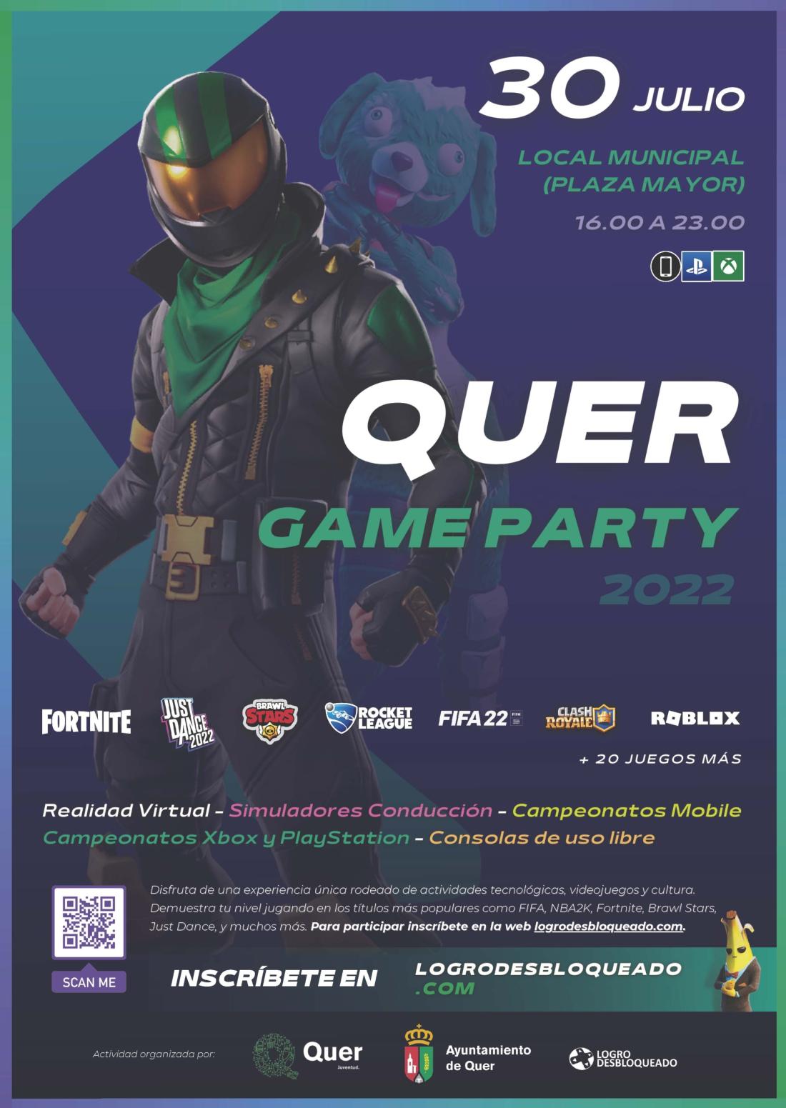 Quedan solo 5 días para que llegue la I Quer Game Party. Se trata de un evento que permitirá jugar a una treintena de videojuegos, previa inscripción gratuita. La actividad se ha programado en el Local Municipal (Plaza Mayor) de Quer, y la gestión irá a cargo de la empresa especializada Logro Desbloqueado.