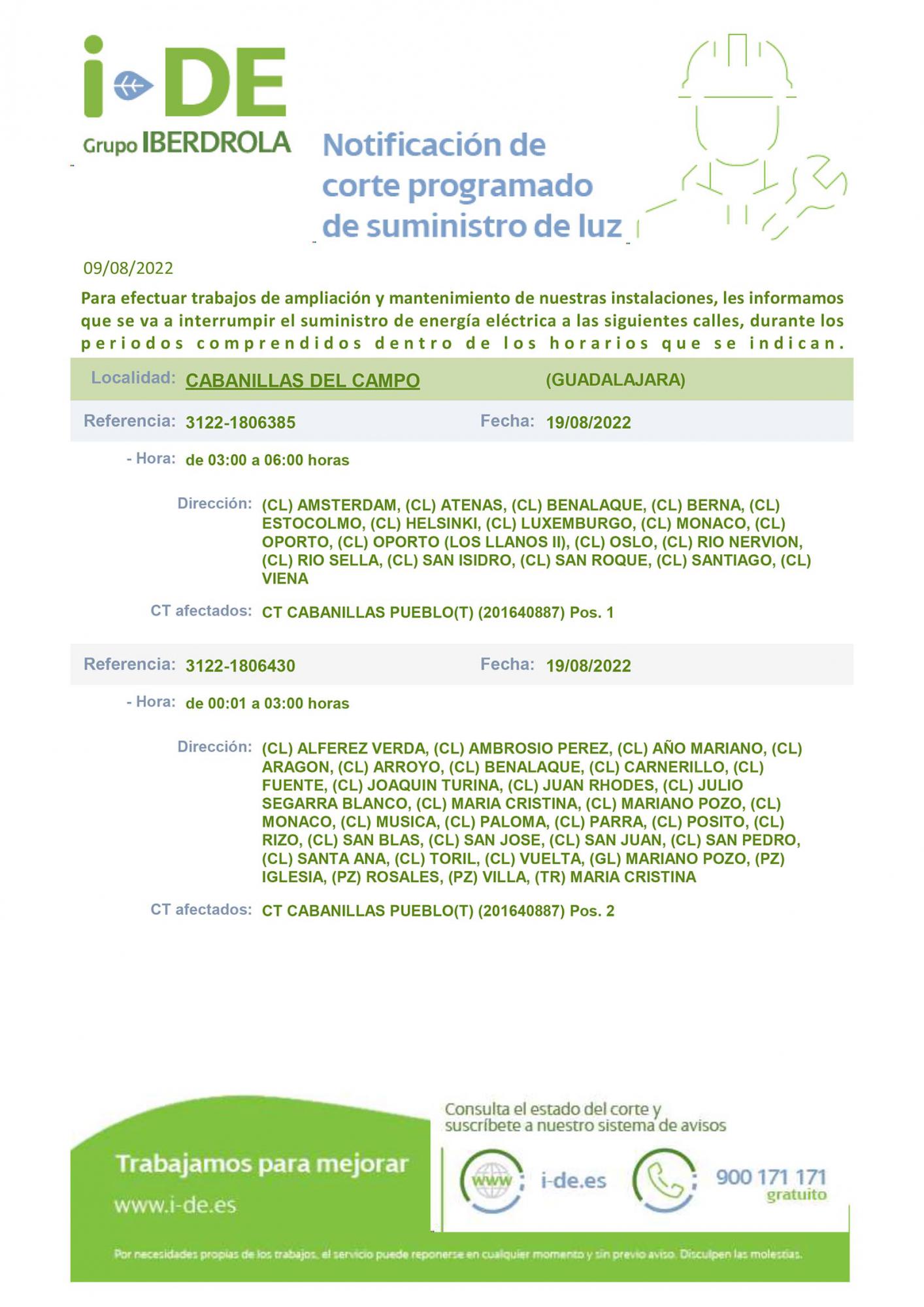 La compañía Iberdrola ha comunicado al Ayuntamiento de Cabanillas que va a efectuar unos cortes programados de suministro eléctrico en la localidad, para labores de mantenimiento de sus instalaciones, que van a afectar a buena parte del casco urbano en la noche y la madrugada del jueves 18 al viernes 19 de agosto de 2022.