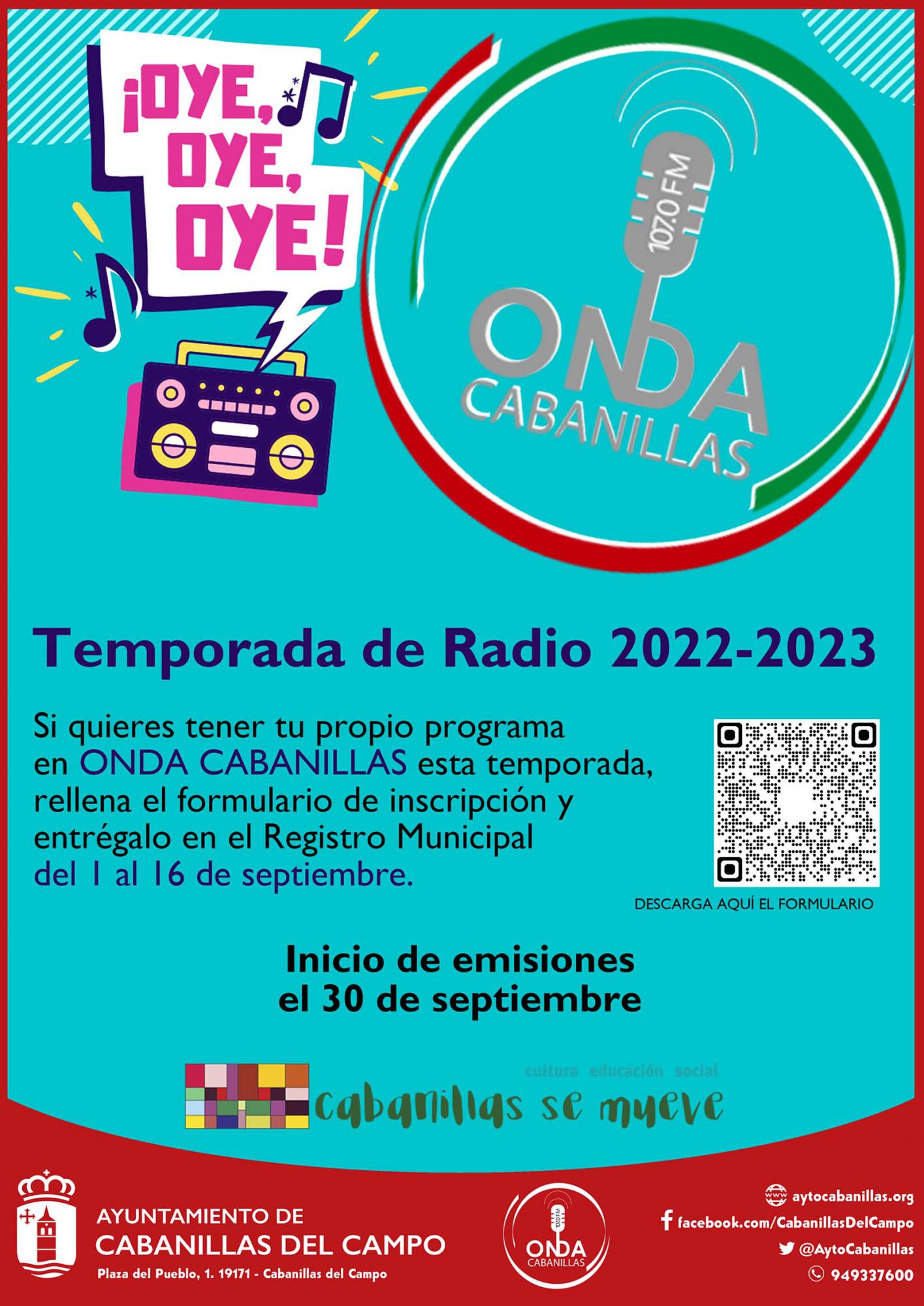 El próximo viernes 30 de septiembre Onda Cabanillas reanudará las emisiones de programas en directo, dando comienzo así a la que será sexta temporada de esta emisora municipal de Cabanillas del Campo, una iniciativa de carácter colaborativo y vecinal, nacida en el otoño de 2017, y que desarrollan personas voluntarias y diferentes colectivos y asociaciones de la localidad. La emisora emite sus programas desde el Centro Joven.