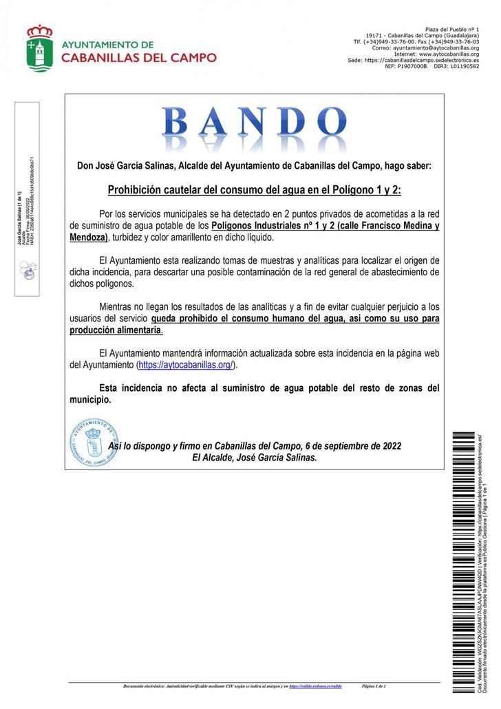 BANDO DE ALCALDÍA: PROHIBIDO EL CONSUMO DE AGUA EN LOS POLÍGONOS 1 Y 2