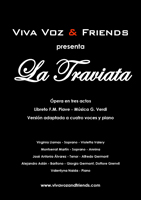 La soprano madrileña Virginia Llamas pondrá voz a la protagonista de la obra –la cortesana Violetta Valeri–, mientras que la tinerfeña Montserrat Martín encarnará a Annina. Como Alfredo Germont actuará el barítono lírico José Antonio Álvarez, y Alejandro Adán se 'desdoblará' como Giorgio Germont y Dottore Grenvil. Al piano, la ucraniana Valentyna Naida.