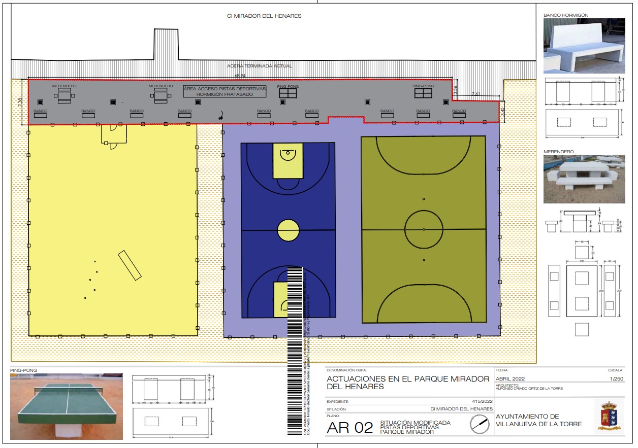 Cabe recordar que el parque del Mirador del Henares tiene unas pistas deportivas y un recinto canino anexo cuyo acceso se realizaba, hasta ahora, a través de una zona de tierra. La intención del Ayuntamiento de Villanueva de la Torre es pavimentar el área e instalar mobiliario urbano variado (bancos, mesas de merendero y mesas de ping pong) para mejorar el acceso a dichas zonas y el entorno. Además, se pretende mejorar la seguridad de utilización de un camino que delimita el parque por su zona sureste y que presentaba un desnivel importante. Para reforzar esa seguridad se va a instalar una barandilla de madera para la protección lateral.