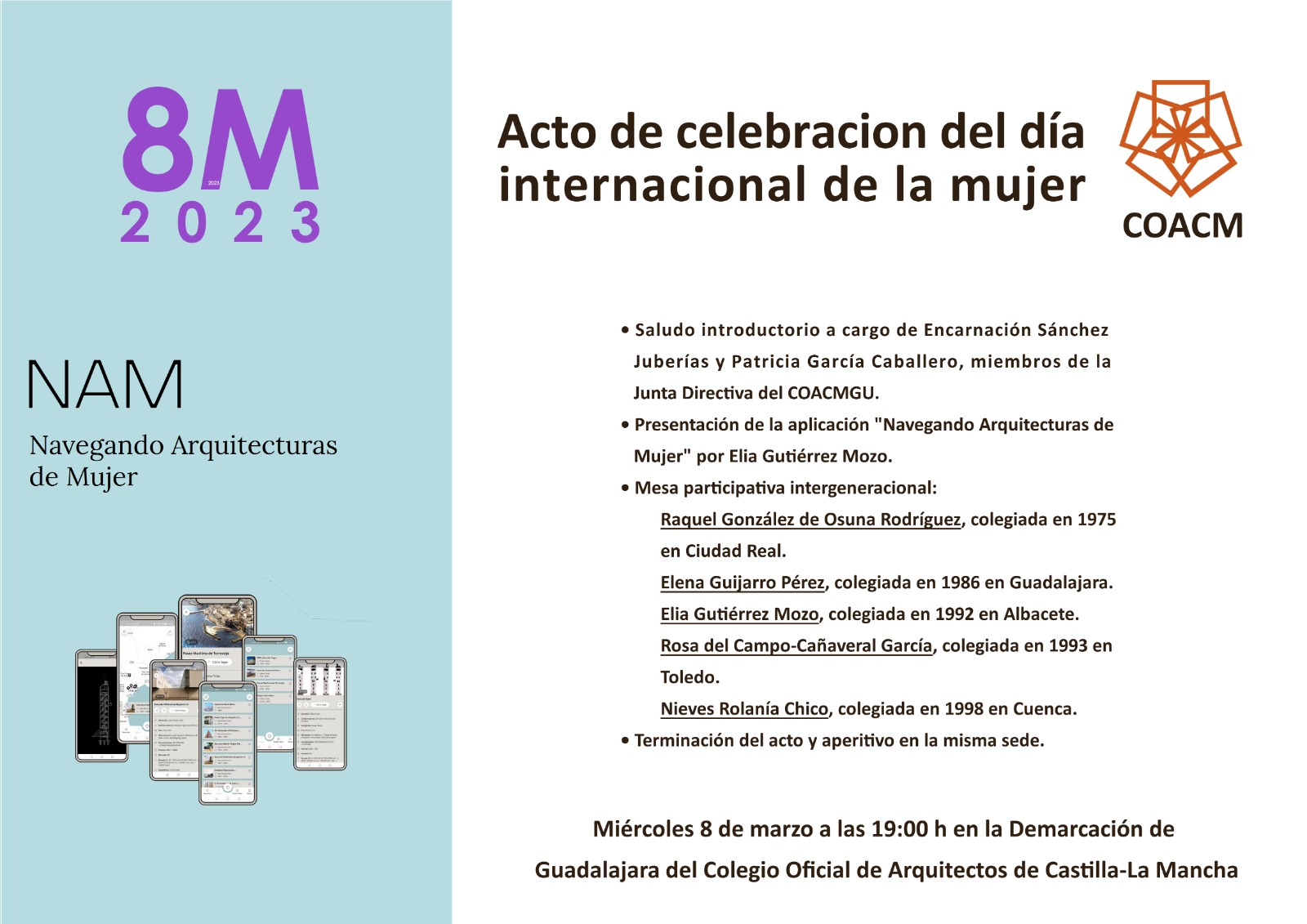 Así, será la propia Elia Gutiérrez Mozo quien, en el acto regional del 8M convocado por el COACM en Guadalajara presentará NAM (Navegando Arquitecturas de Mujer), una aplicación para móvil que geolocaliza las obras de autoría femenina, en solitario o en colaboración con otras mujeres, realizadas entre 1978 y 2008 en el territorio nacional.