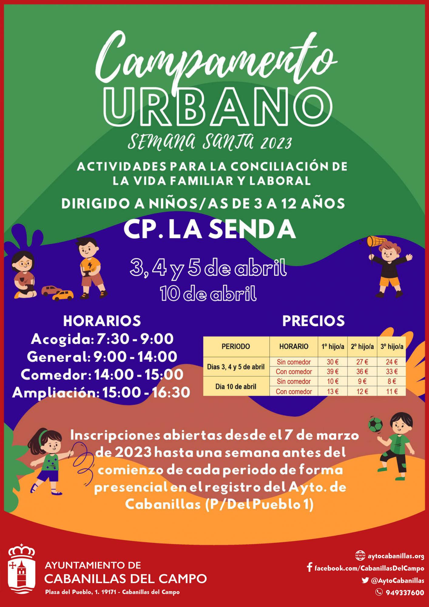 El Ayuntamiento de Cabanillas del Campo ofrece una vez más la opción de un Campamento Urbano a las familias con hijos e hijas en edad escolar, en la próxima temporada de vacaciones escolares en Semana Santa. Habrá cuatro jornadas de campamento, coincidiendo con los cuatro días que no son festivos, pero en los que sí hay vacaciones escolares: de Lunes a Miércoles Santo (3-5 de abril), así como el Lunes de Pascua (10 de abril).