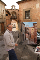 Antonio Darias terminaba su cuadro al filo de las 15:30 horas. Se había parado en mitad de la cuesta de la calle Arcedianos, procedente de Sabadell. "Sigüenza es una ciudad muy pictórica. Tiene muchos rincones bellos, conserva su aire medieval, no es plana, tiene subidas y bajadas que favorecen la perspectiva, y la luz ilumina encajes muy bonitos", decía con su cuadro en la mano. Eligió el lugar la noche anterior. "Mi estilo es diferente al de cualquier otro. Es un cuadro de Antonio Darias, y estoy satisfecho con el trabajo", explicaba.