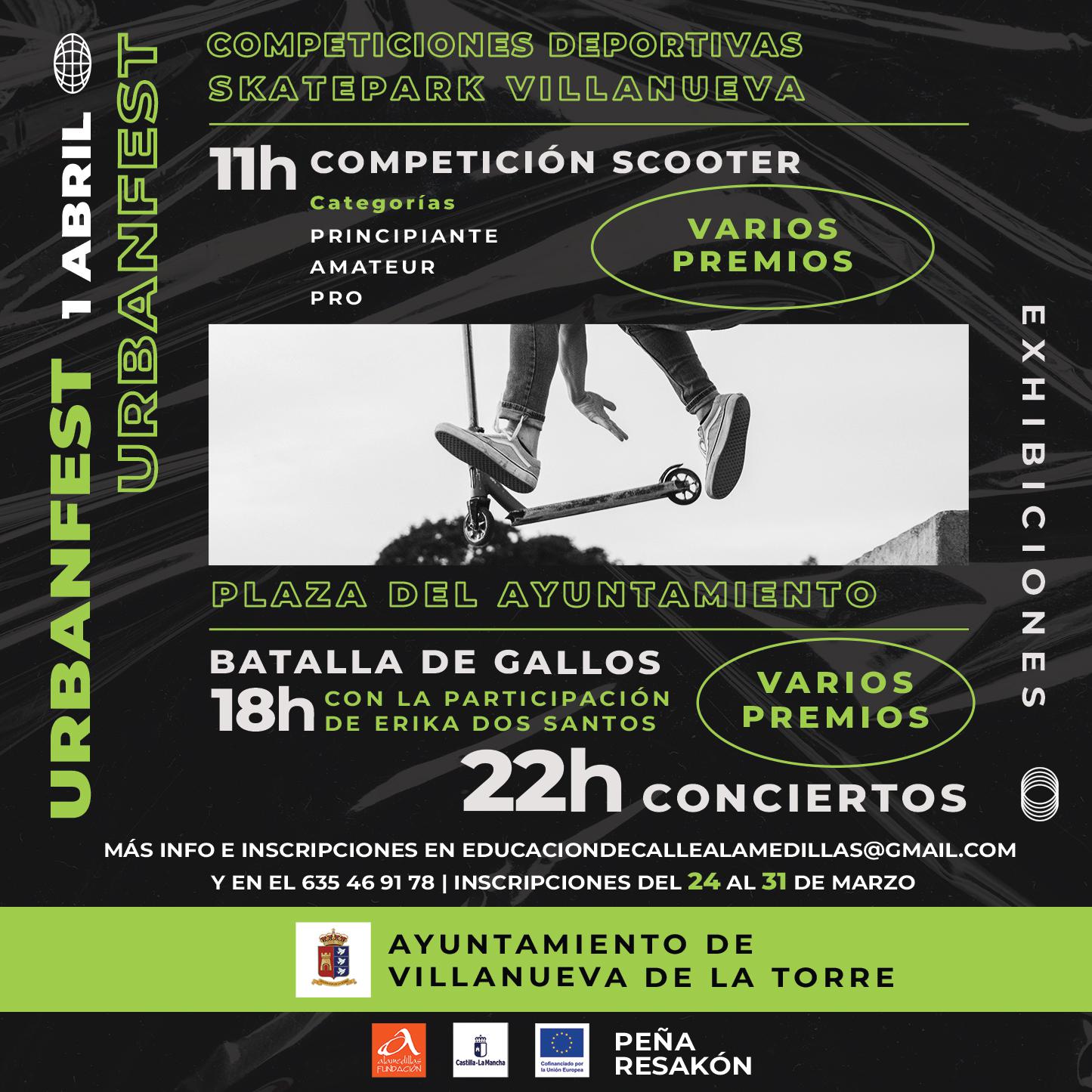 El Urban Fest es un festival que ofrece espacios de ocio alternativo saludable, donde se mezclan las actividades deportivas relacionadas con el skate y la música o cultura urbana. Así, el evento va a contar con una competición de Scooter en la mañana del sábado (a partir de las 11 horas). Se han establecido como categorías la de principiante, amateur y pro, con premios para las o los mejores clasificados. También habrá demostraciones y diferentes exhibiciones.