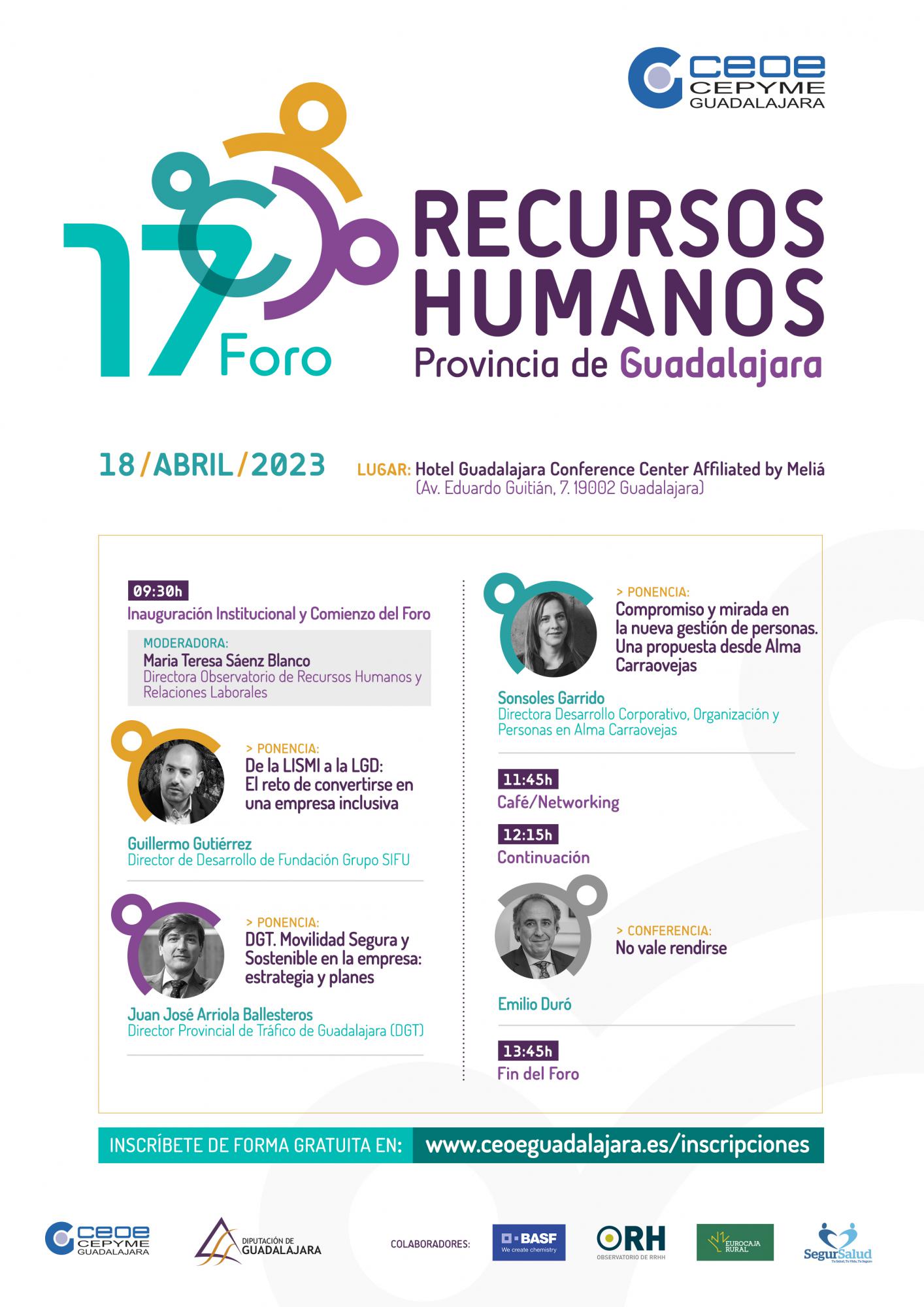 Para esta décimo séptima edición del Foro de RR.HH. de la provincia de Guadalajara, la patronal alcarreña ha elaborado, como en ediciones anteriores, un programa con ponentes y expertos de primer nivel y reconocido prestigio, tanto a nivel nacional como internacional, con el objetivo de conocer las últimas novedades en movilidad y sostenibilidad, cómo ser una empresa más inclusiva, como gestionar personas, pero sobre todo y, lo más importante para un empresario y una empresa, no rendirse nunca.