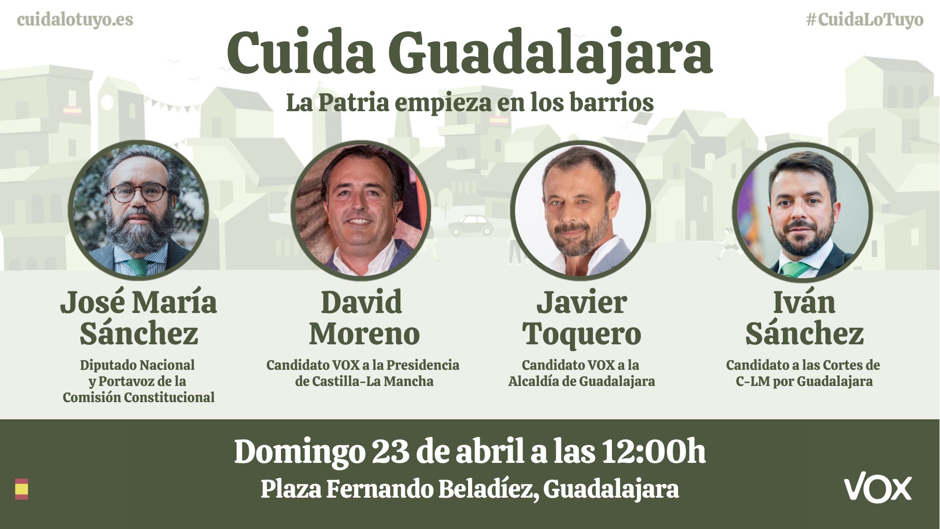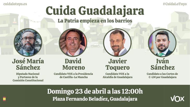 Guadalajara acoge este domingo 23 de abril desde las 12.00 horas un acto de precampaña de VOX Guadalajara. Bajo el lema de Cuida lo Tuyo la formación reunirá en la plaza de Fernando Beladíez de la capital a afiliados y simpatizantes de toda la provincia.