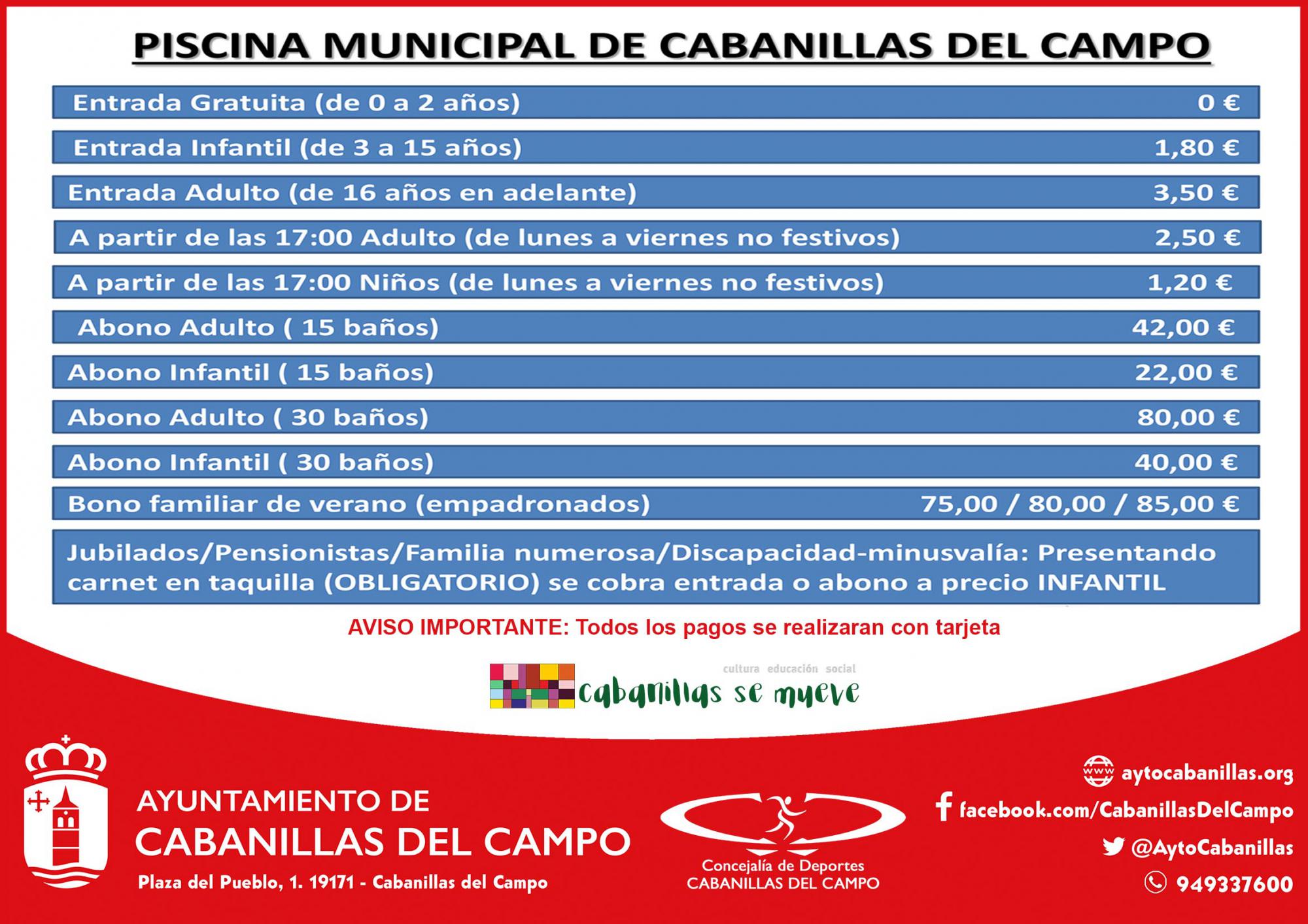 Abono familiar sin límite de baños (75€ para 2 miembros de la misma unidad familiar; 80€ para 3 miembros y 85€ para 4 o más miembros). Este abono es sólo para empadronados, condición que se deberá acreditar.