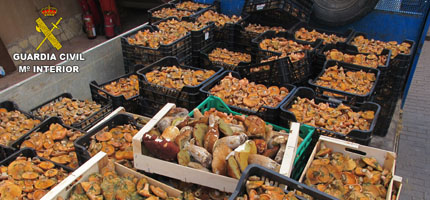 La Guardia Civil denuncia a cinco personas por comerciar con níscalos sin autorización e incumpliendo las leyes sanitarias”. Se han incautado 147 cajas de níscalos (Lactarius deliciossus) con un peso aproximado de unos 592 kilogramos.