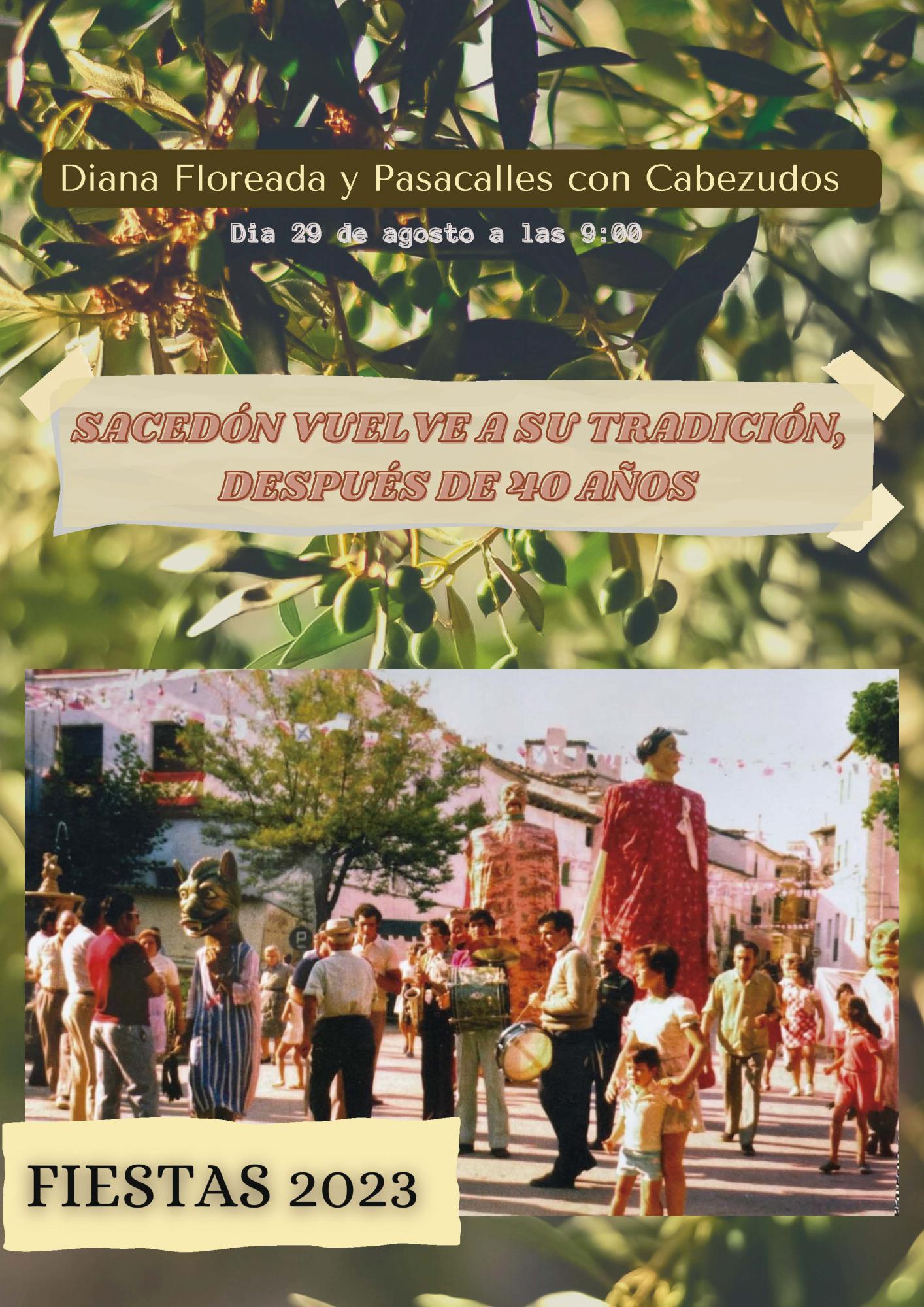 El 29 de agosto, en plenas fiestas en honor de la Santa Cara de Dios, Sacedón retomará una costumbre añeja, que data de principios de los años 50 del pasado siglo, según la cronista oficial del municipio, María Jesús Moya: la diana floreada con charanga y cabezudos.