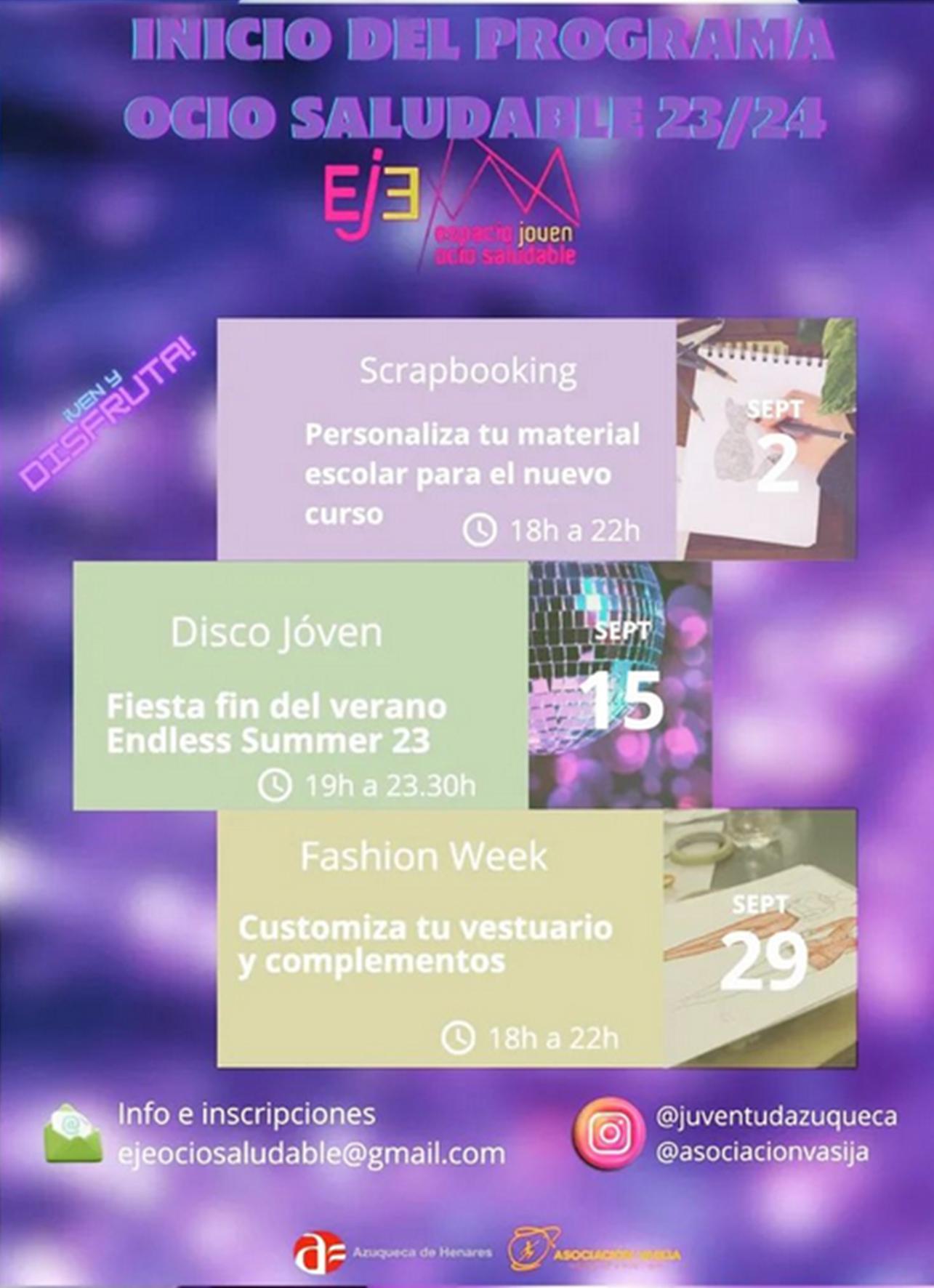 Con un taller de Scrapbooking, se pone en marcha este sábado el programa 'Ocio Saludable' dirigido a la población joven de Azuqueca de Henares y organizado por el Ayuntamiento. El concejal Azuqueca Futuro, Enrique Pérez de la Cruz, adelanta que "se han previsto tres sesiones con propuestas distintas para este mes de septiembre los días 2, 15 y 29, con el objetivo de ofrecer actividades de entretenimiento alternativo, participativo y educativo que fomenten la cooperación y la tolerancia”. Las actividades se dirigen a personas con edades comprendidas entre los 12 y los 30 años.