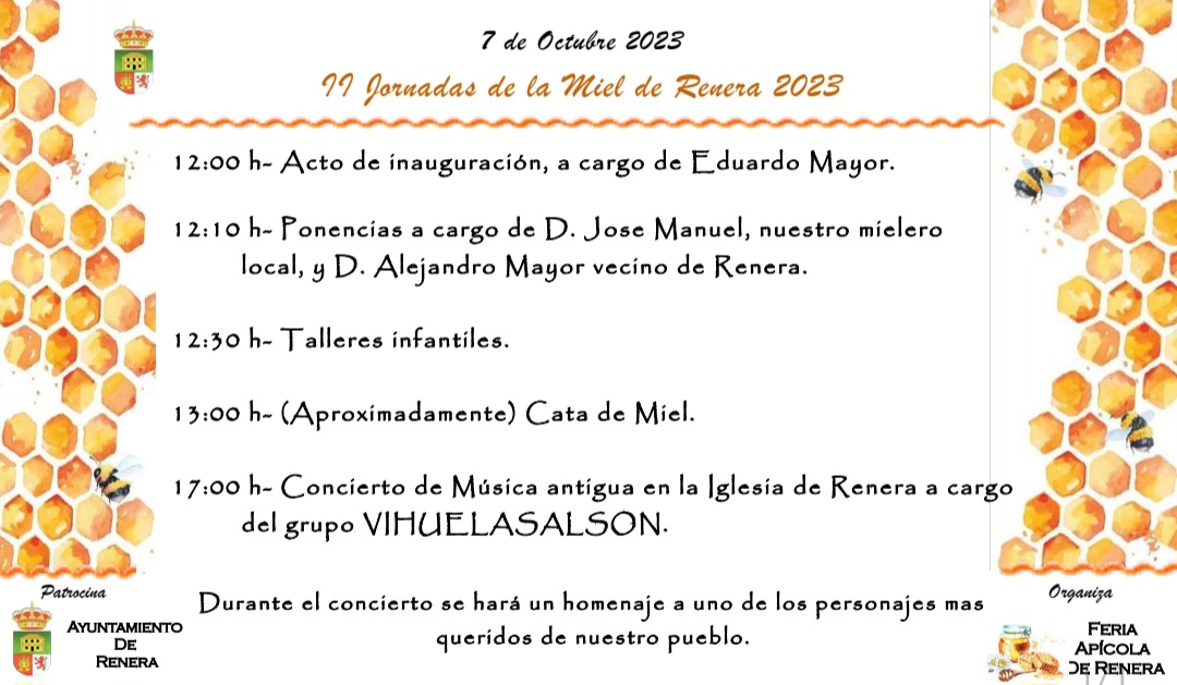 Durante la jornada del sábado habrá cata de miel y talleres infantiles a cargo de José Manuel, mielero local, con la colaboración de Alejandro Mayor (Jani) que compartirá sus conocimientos sobre los antiguos colmenares en Renera. Los vecinos compartirán también una paella popular en la plaza del pueblo.
