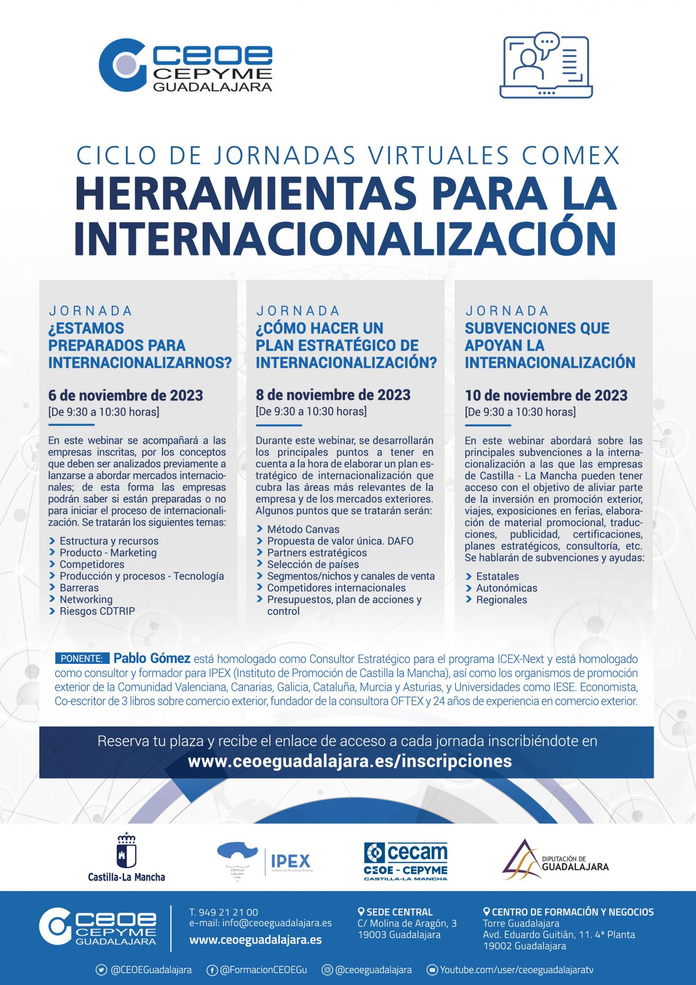 El departamento de Comercio Exterior de CEOE-CEPYME Guadalajara ha organizado un nuevo ciclo de jornadas virtuales basadas en herramientas para la internacionalización que se van a desarrollar durante el mes de noviembre, concretamente los días 6, 8 y 10.