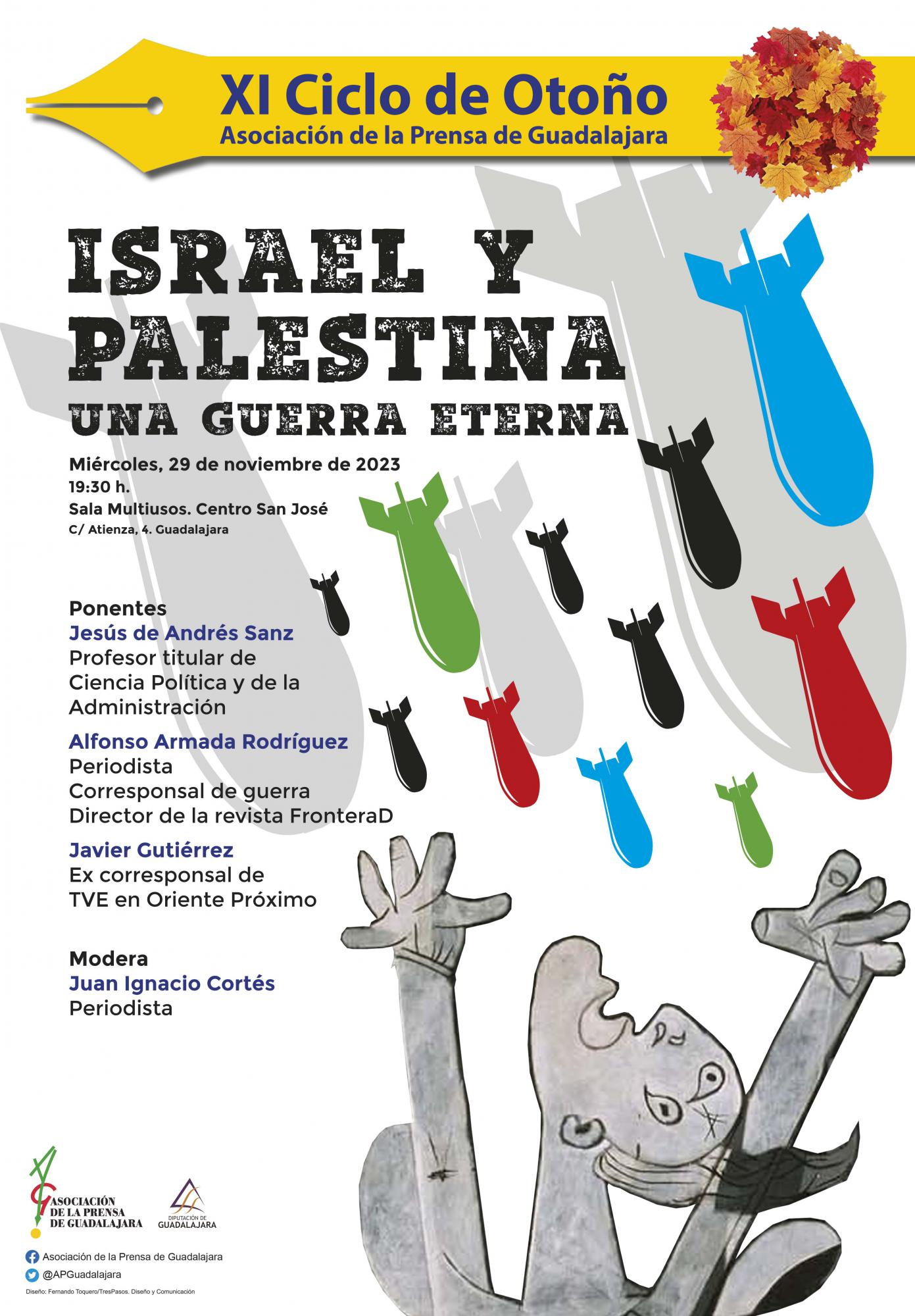 La segunda conferencia será el miércoles 29 de noviembre, a las 19:30 horas, en la Sala Multiusos del Centro San José, bajo el título “Israel y Palestina. Una guerra eterna”. Los ponentes serán Jesús de Andrés Sanz, profesor titular de Ciencia Política y de la Administración; Alfonso Armada Rodríguez, periodista, corresponsal de guerra y director de la revista FronteraD y Javier Gutiérrez, ex corresponsal de TVE en Oriente Próximo. Moderando esta charla estará el periodista Juan Ignacio Cortés.