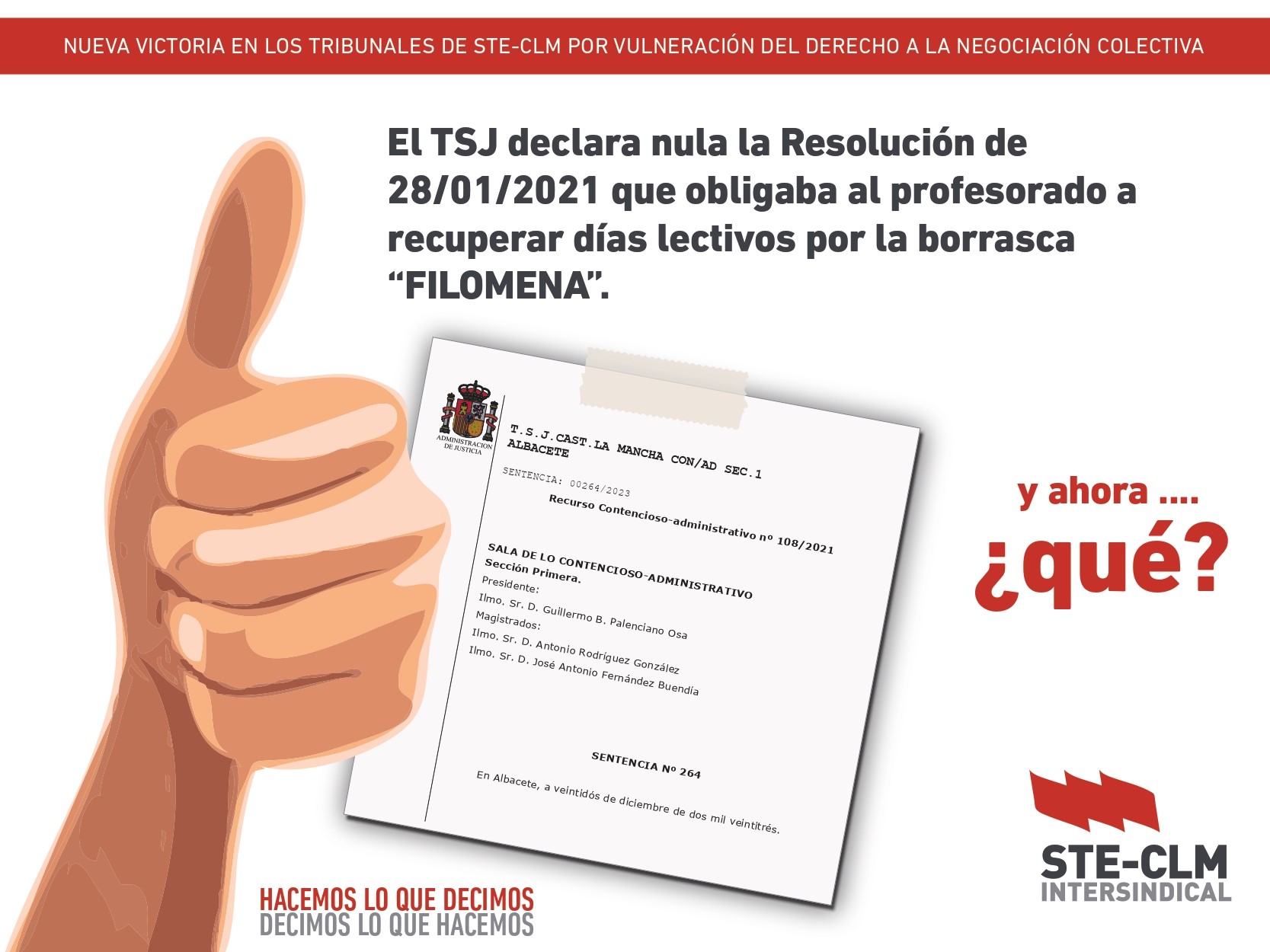 El Tribunal Superior de Justicia ha declarado nula la Resolución que obligaba al profesorado a recuperar días lectivos por la borrasca “Filomena”, estimando de esta forma la demanda interpuesta por el sindicato STE-CLM contra la Resolución de 28/01/2021 de la Consejería de Educación, que modificaba el calendario Escolar de las enseñanzas no universitarias para el curso académico 2020/2021.