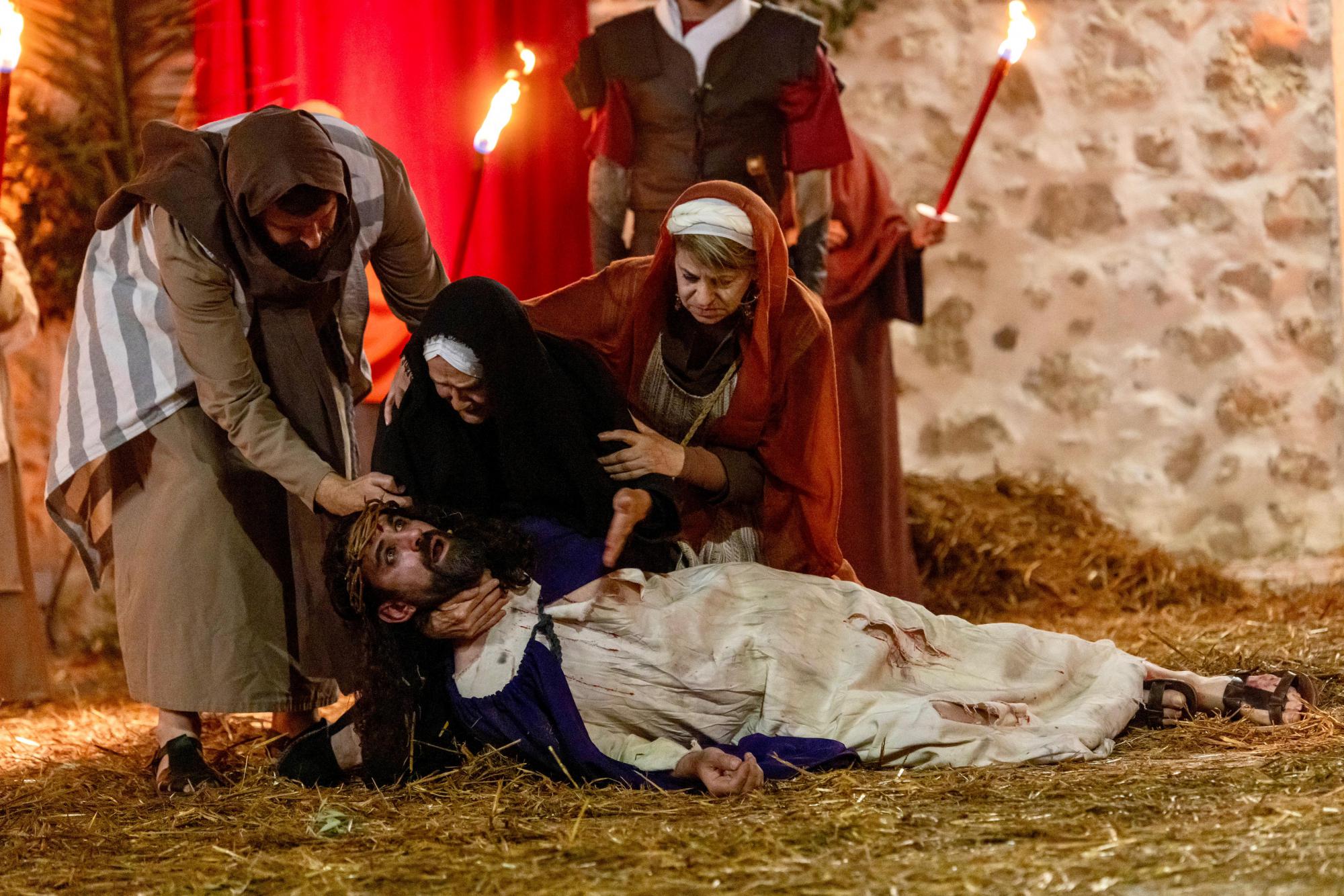 La parte del Calvario y la Crucifixión se desarrolla en otro paraje a las afueras, sobre un terreno elevado que emula el monte Gólgota, ya bajo la luz de la luna y las antorchas.