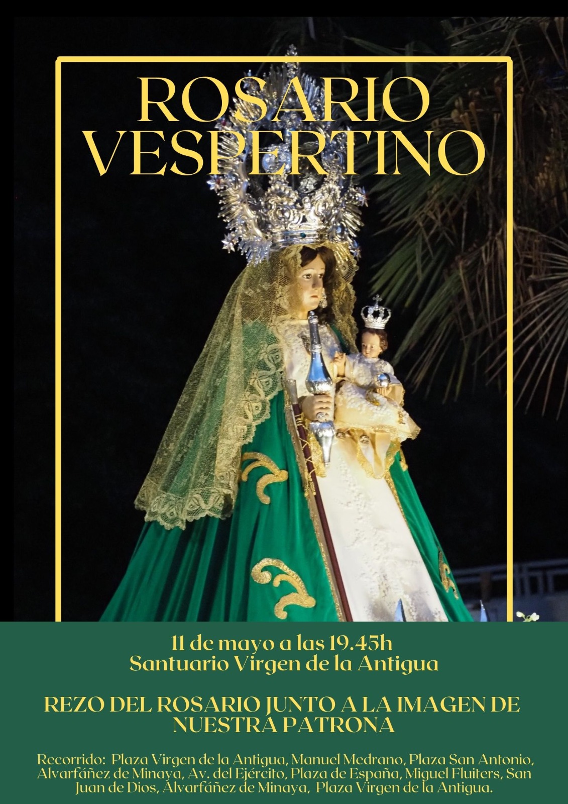 Con motivo de los actos, cultos y procesiones que la Real e Ilustre Cofradía de Nuestra Señora la Virgen de la Antigua ha preparado para honrar a Nuestra Madre, en el mes de mayo, en el que se reconoce la obra de María en la historia de la salvación, a partir de su Maternidad Divina, con el fin de expresar el auténtico amor a la Virgen de la piedad del pueblo cristiano, el próximo sábado día 11 de mayo, con posterioridad a la eucaristía que se celebrará a las 19.00 horas en el Santuario de la Antigua, se va a proceder al rezo del Santo Rosario acompañando a nuestra Señora la Virgen de la Antigua, portada por hermanos de la Cofradía en procesión por las calles adyacentes a su Sede Canónica.