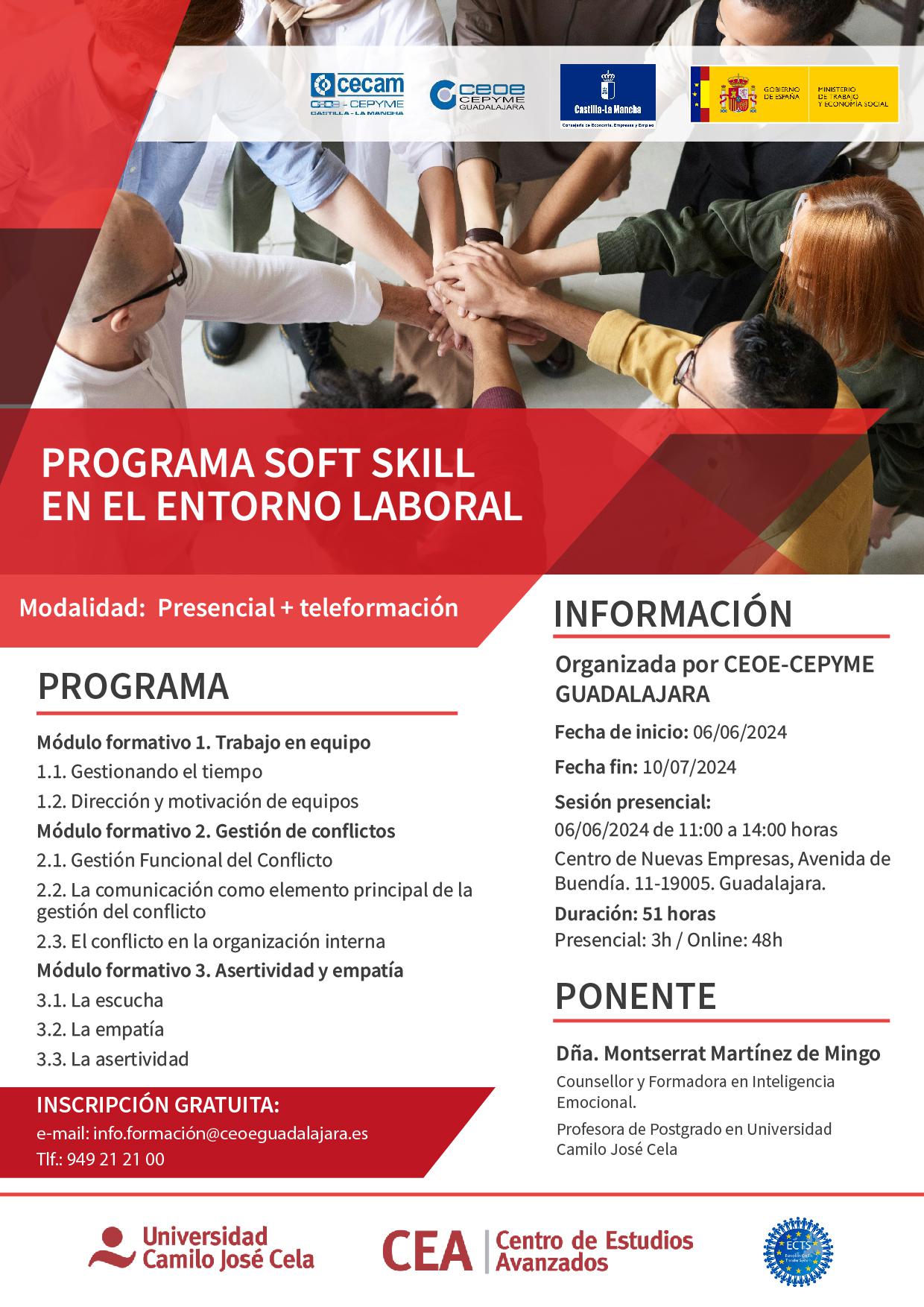 CEOE-CEPYME Guadalajara, en colaboración con CECAM, la Junta de Comunidades de Castilla-La Mancha, el ministerio de Trabajo y Economía Social y el Centro de Estudios Avanzados de la Universidad Camilo José Cela, organizan por quinto año, una jornada de experto titulada, en esta ocasión “Programa soft skill en el entorno laboral” que se desarrollará del 6 de junio al 10 de julio, con una jornada presencial el 6 de junio de 11:00 a 14:00 horas en el centro de nuevas empresas de Guadalajara. El resto del programa, que es gratuito, se desarrollará de manera online.