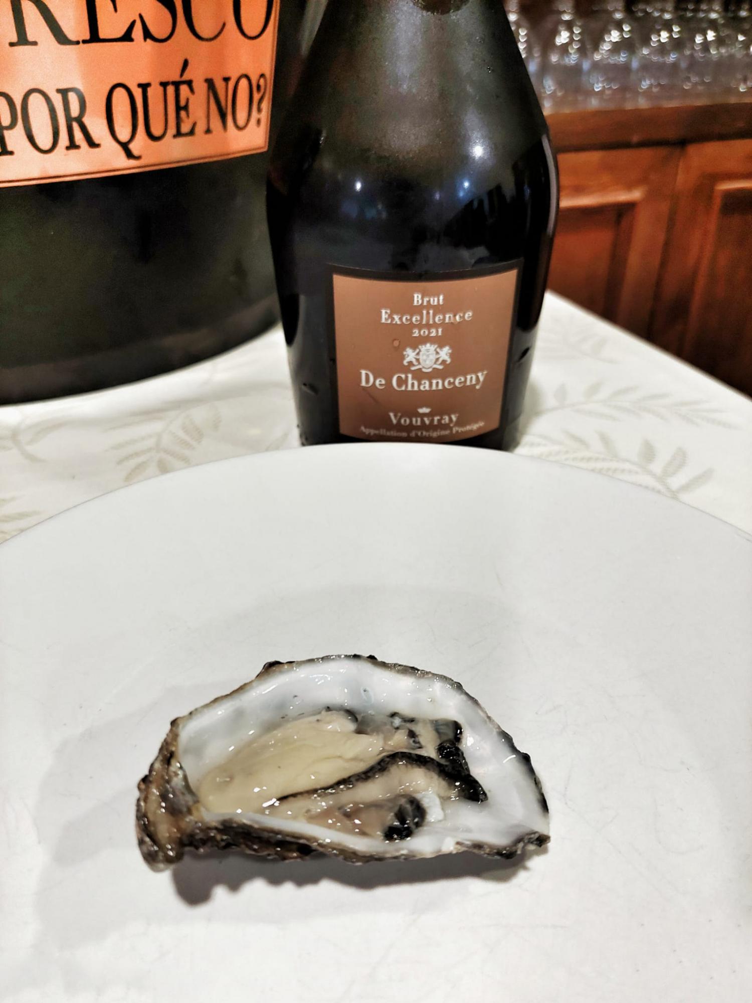 Se inició con Ostras de Normandía y de Marennes Oleron de nuestro pais vecino francés las cuales fueron al natural, en tempura y en ceviche, con las explicaciones oportunas del representante de la firma “ HUITRES AIMÉ” en cuanto al procedimiento de apertura de ellas así como la variedad de sus nutrientes, el restaurante optó por un vino espumoso del Valle del Loira, de la variedad Chenin blanc de la marca De Chancenny Vouvray Brut Excellence.