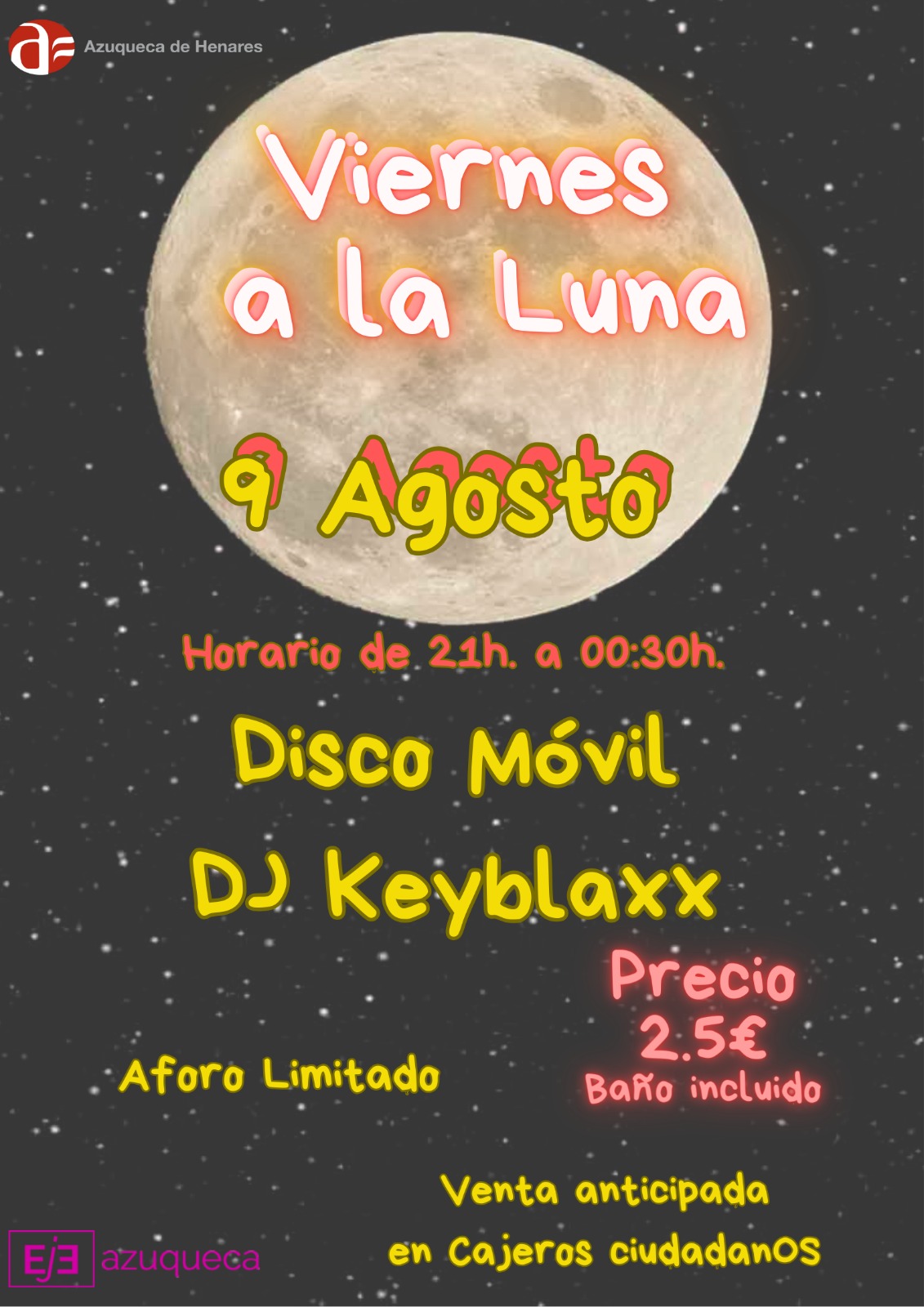Ya están a la venta en los cajeros ciudadanos las entradas para la última sesión del programa "Viernes a la Luna" que organiza el Ayuntamiento de Azuqueca de Henares en las instalaciones municipales de la piscina de verano, en el Complejo Deportivo San Miguel. Este viernes, día 9 de agosto, la animación la pondrá una disco móvil y DJ Keyblaxx.