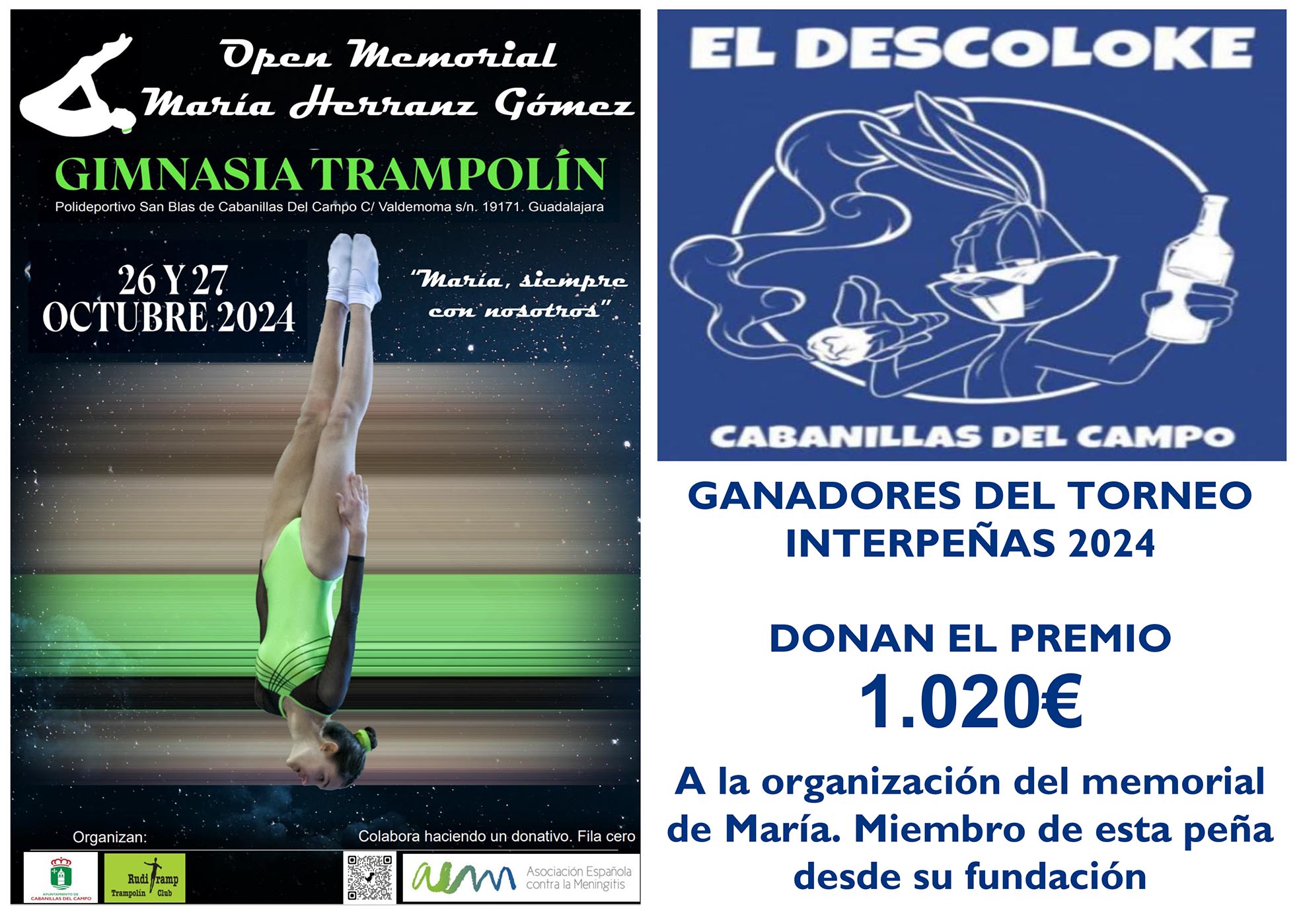 La peña “El Descoloke”, que ganó la última edición de los Juegos Interpeñas de Cabanillas, disputados en el fin de semana previo a las Fiestas de este año 2024, ha decidido donar el premio en metálico de esta edición a la organización del próximo “Torneo Memorial María Herranz Gómez” de gimnasia de trampolín, que se celebrará en el Polideportivo San Blas de Cabanillas del Campo los próximos días 26 y 27 de octubre, organizado por el Club Ruditramp y el Ayuntamiento de la localidad.